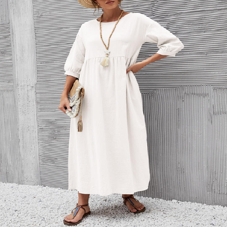 เดรสผ้าฝ้ายและผ้าลินินทรงหลวม แขนทรงโคมไฟ สีพื้น สไตล์ลำลองสำหรับผู้หญิง รุ่นใหม่ ปี 2025 มีกระเป๋า พร้อมส่ง