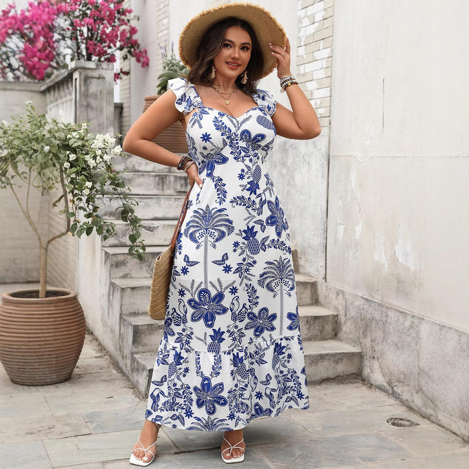 เดรส2025ลายดอกไม้หรูหราสำหรับผู้หญิงขนาดใหญ่พิเศษเดรสปาร์ตี้น่ารักสไตล์เก๋ๆใส่ไปชายหาดในฤดูร้อน