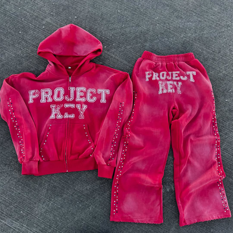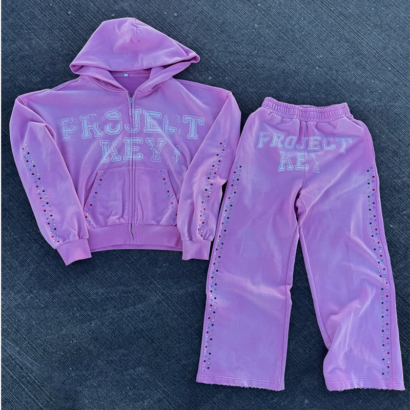 ชุดวอร์มกางเกงวอร์มมีซิปทรงแบ็กกี้ประดับพลอยเทียมตามสั่งแนวสตรีทชุดวอร์มกางเกงวอร์มขาบานและเสื้อมีฮู้ด