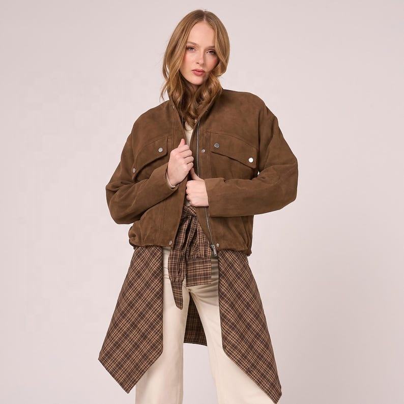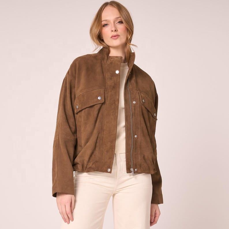 แจ็คเก็ตหนังแท้สีน้ำตาลเข้มทรงโอเวอร์ไซส์สำหรับผู้หญิง ฤดูใบไม้ร่วง 2026 หนังกลับแท้ แบบบอมเบอร์ ปิดด้วยซิปและกระดุม ระบายอากาศได้ดี กันลม
