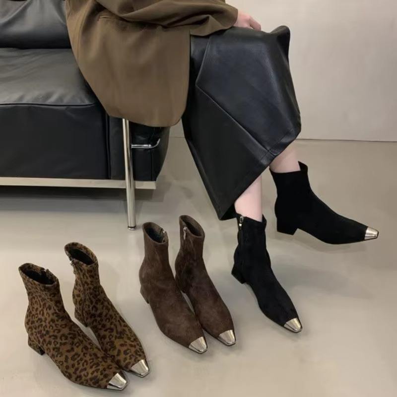 รองเท้าบูทข้อเท้าทรงสลิม ส้นหนา ส้นสูง หนังกลับ แฟชั่นหัวเหลี่ยมสำหรับผู้หญิง คอลเลคชั่นใหม่ ฤดูใบไม้ร่วง-ฤดูหนาว ปี 2026