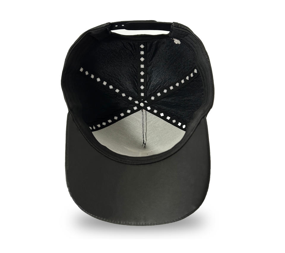 หมวกหนังสีดำปี 2026 แบบ 5 ชิ้นส่วน ทรงแข็ง พร้อมโลโก้ปักด้านหน้า สายรัดแบบกำหนดเองด้านใน และโลโก้ปักด้านหลัง