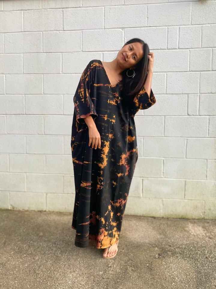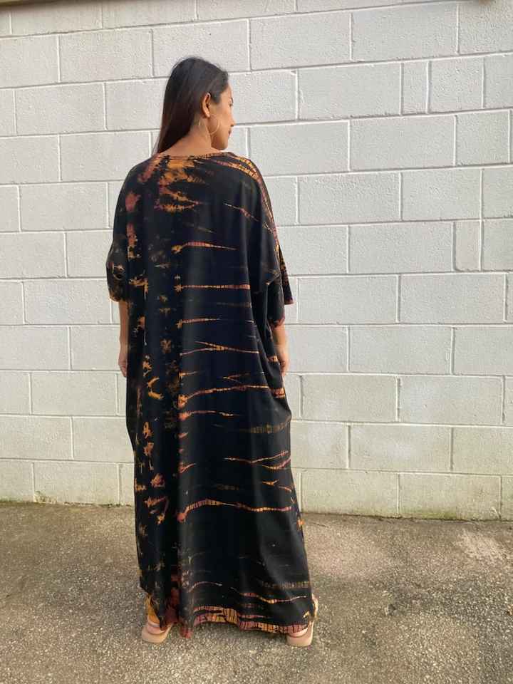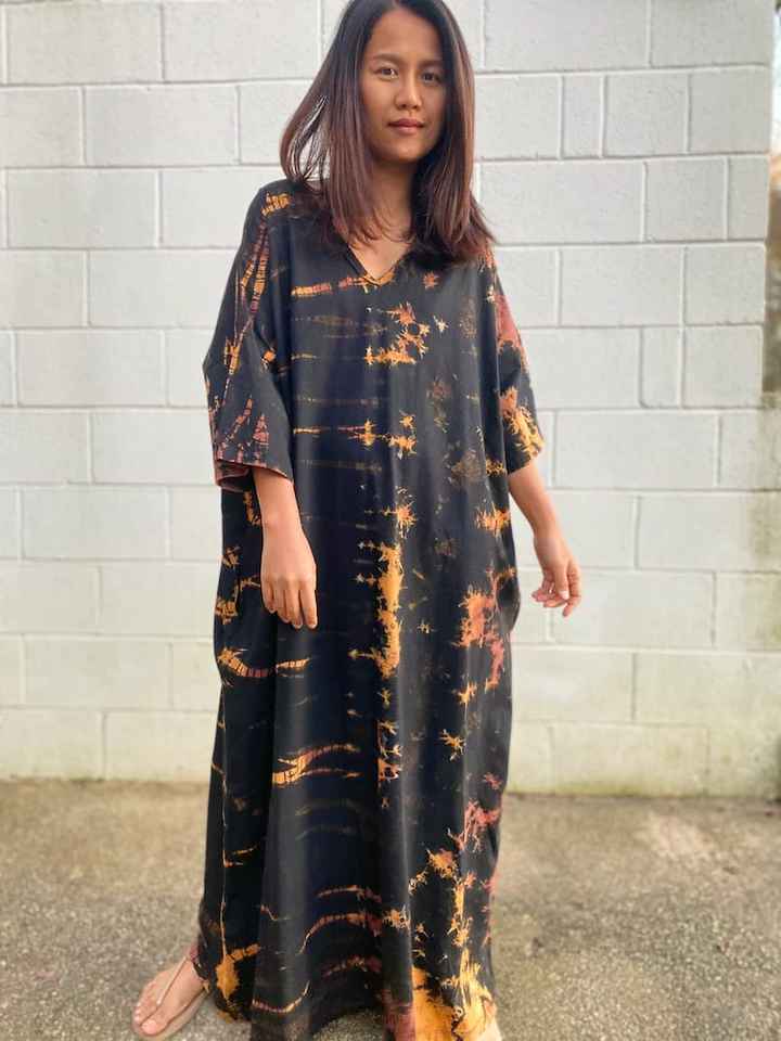 ชุดคลุมสไตล์โบฮีเมียน ปี 2026 ชุดเดรสหลวมๆ สำหรับผู้หญิง ฤดูร้อน ลายมัดย้อมสีดำ คาฟทันพิมพ์ลาย แขน 3/4 คอวี ผ่าข้าง ชุดเดรสยาวสำหรับใส่ไปชายหาด