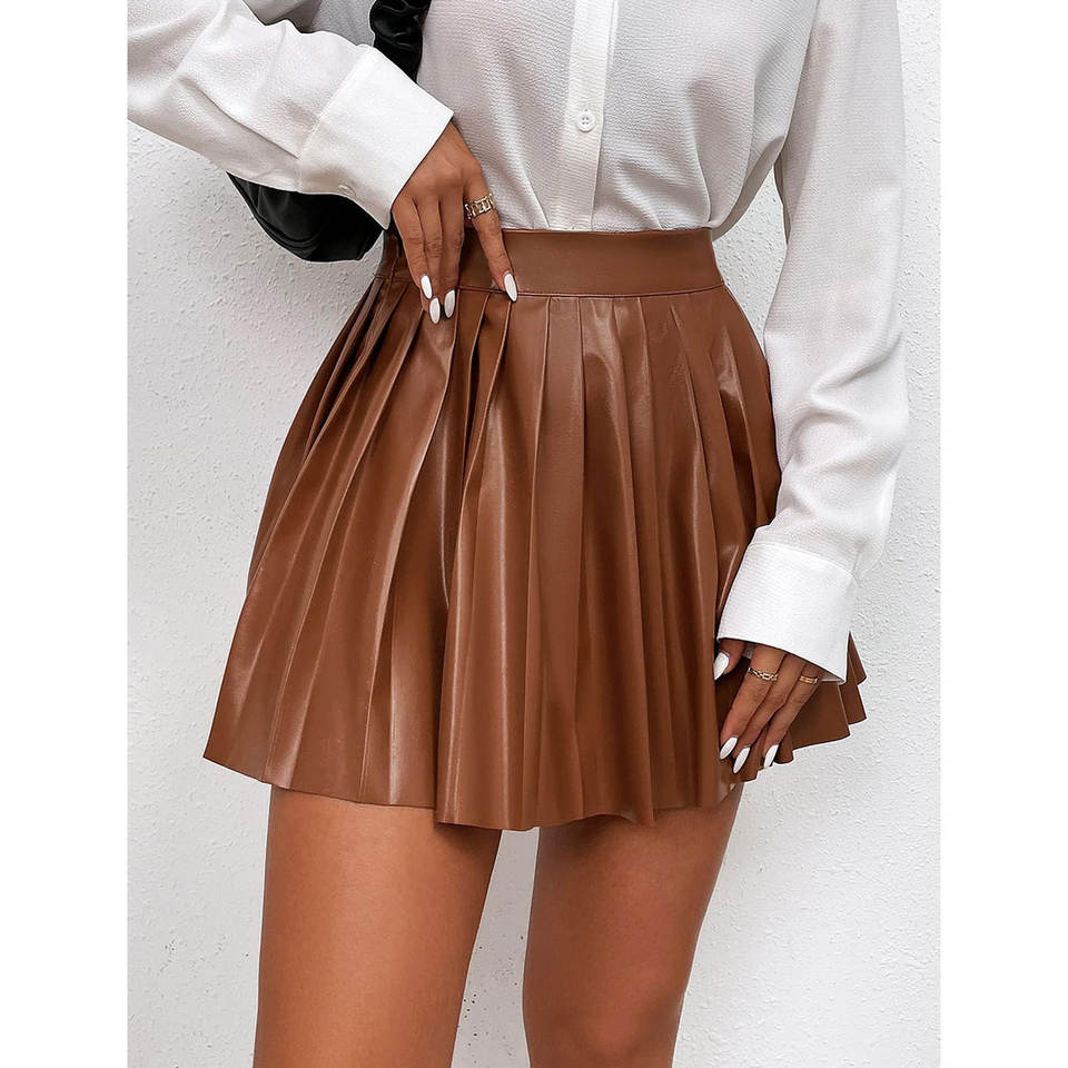 กระโปรงหนัง PU สีน้ำตาลทรงเอวสูงจีบระบายสำหรับผู้หญิง ปี 2026 กระโปรงมินิหนังเทียมสำหรับงานปาร์ตี้ สั่งตัดได้