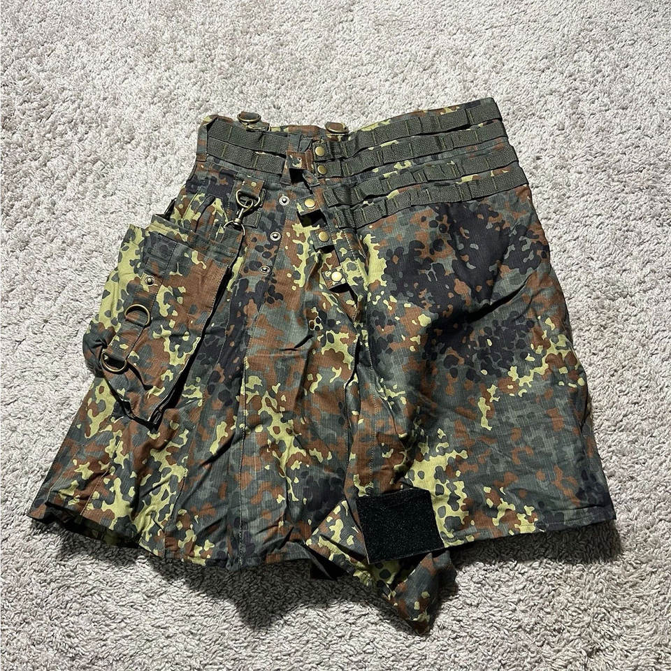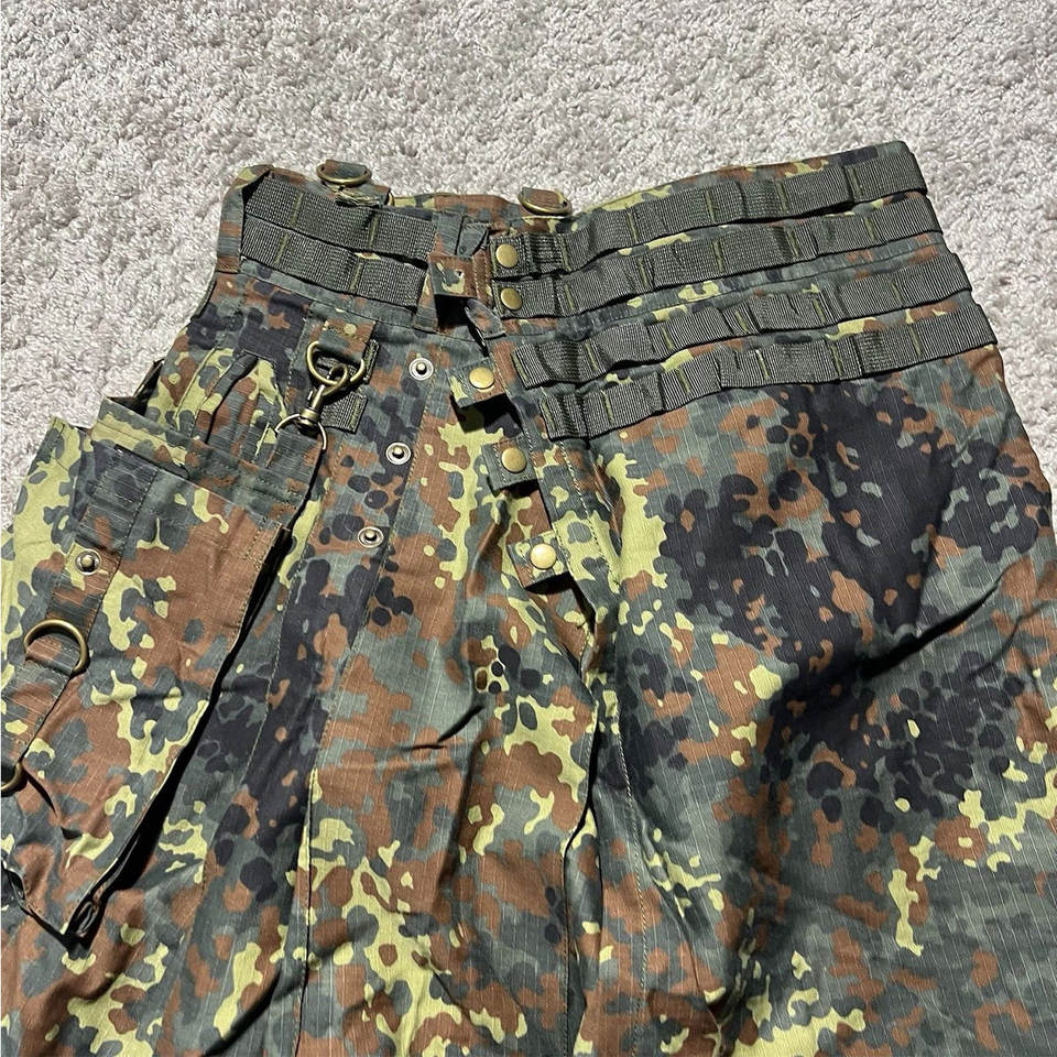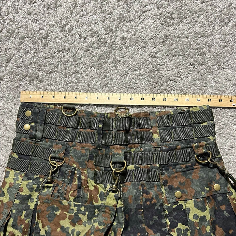 กระโปรงกางเกงคาร์โก้ลายพรางทหารสีเทาสำหรับผู้ชาย รุ่นปี 2026 แบบจีบ มีกระเป๋า พร้อมกระดุมแป๊กและสายรัด