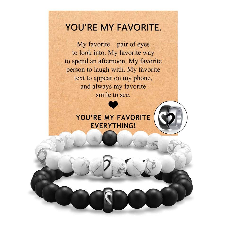 สร้อยข้อมือคู่รักสแตนเลสสตีลคลาสสิกปี 2026 สีดำด้านประดับลูกปัดสีขาวเทอร์ควอยซ์หินธรรมชาติสำหรับผู้ชายและผู้หญิง