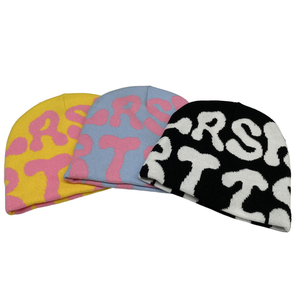 2026 Custom High Quality Jacquard Logo 100% Acrylic Knit Beanie Hat Letter Pattern Travel Y2K Style All Over Print Beanie Caps