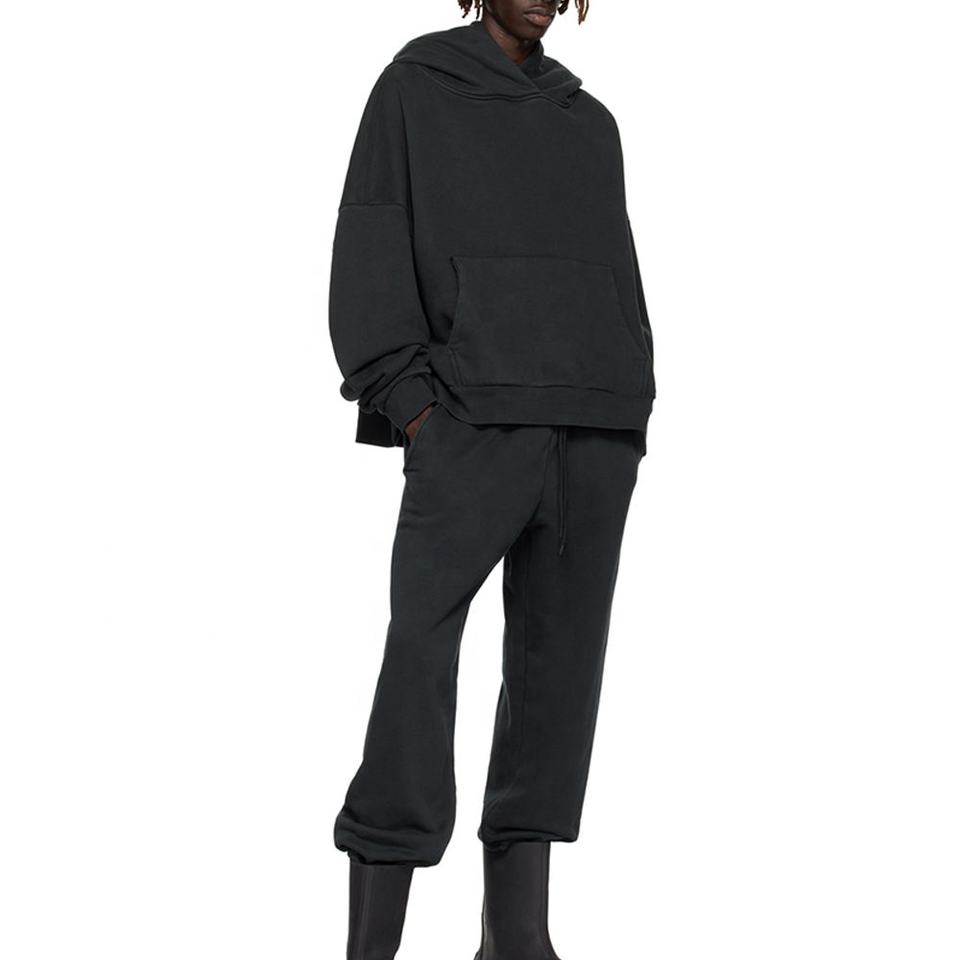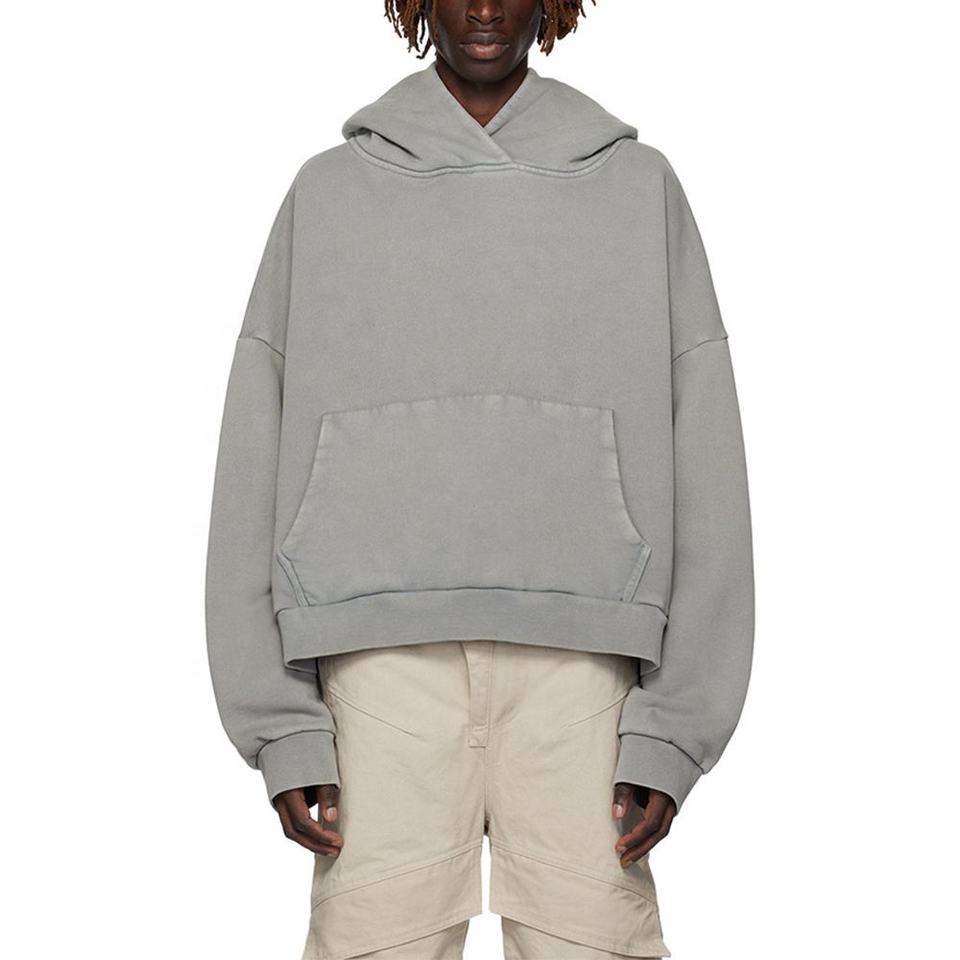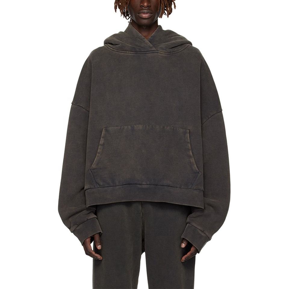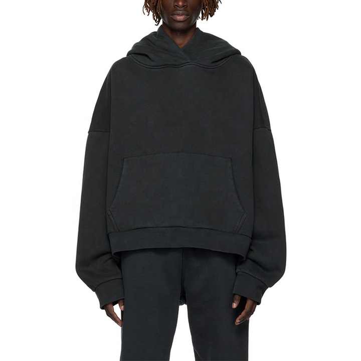 เสื้อฮู้ดดี้ทรงบ็อกซี่แบบครอปสำหรับผู้ชาย พิมพ์โลโก้ตามสั่ง ปี 2026 ผ้าฟอกสี 500gsm คุณภาพสูง ทรงโอเวอร์ไซส์ สีดำ ลุคทำเก่า