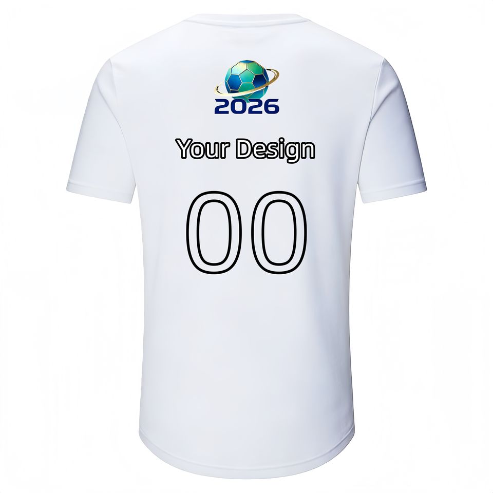 เสื้อฟุตบอลผู้ชายแบบกำหนดเอง ปี 2026 ผ้าโพลีเอสเตอร์ 100% คอกลม แห้งเร็ว สีขาวล้วน รับสกรีนโลโก้ ขายส่ง