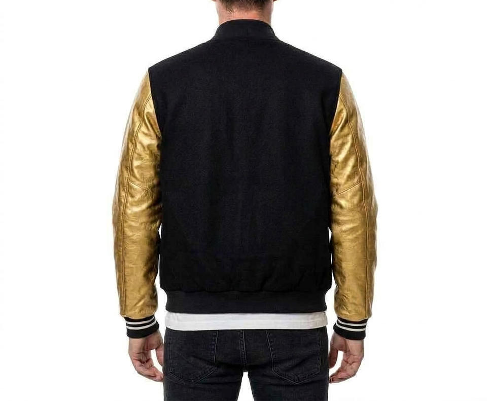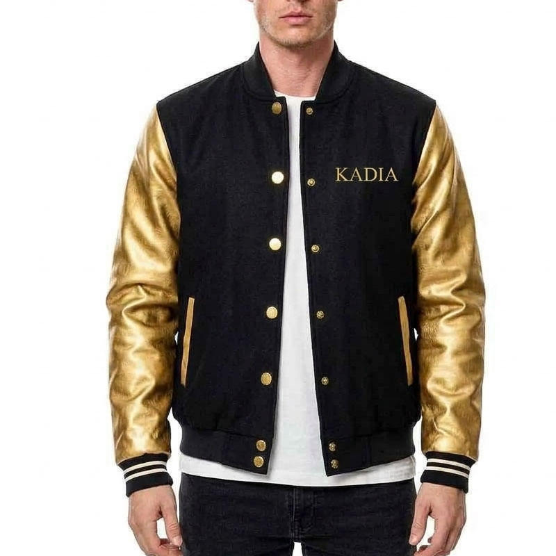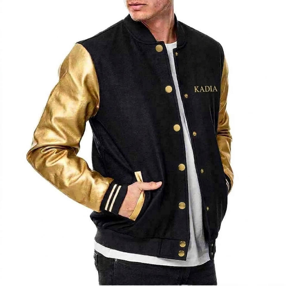 แจ็คเก็ตวาร์ซิตี้ฤดูหนาวคุณภาพพรีเมียมแบบสั่งทำปี 2026 แขนสีทอง โลโก้ด้านหน้าแบบเรียบ ทนลม ระบายอากาศได้ดี สำหรับผู้ชาย
