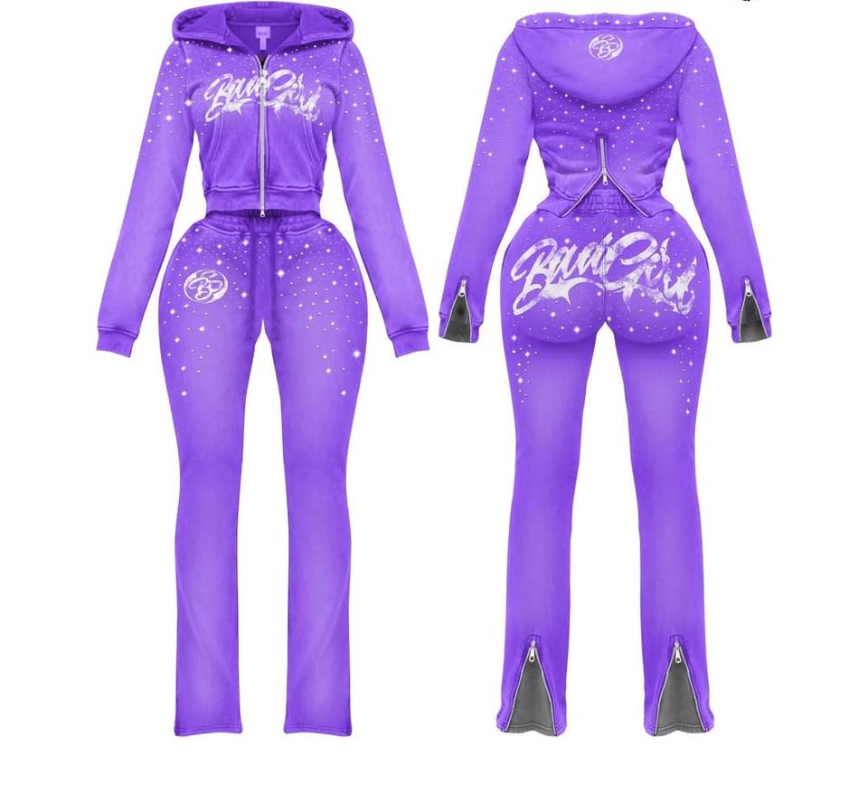 ชุดเซ็ตเสื้อครอปฮู้ดดี้และกางเกงขายาวประดับโลโก้คริสตัลแบบสั่งทำปี 2026 สไตล์วินเทจขาดๆ แบบสองชิ้น ชุดเสื้อผ้าผู้หญิง แฟชั่นสตรีทแวร์