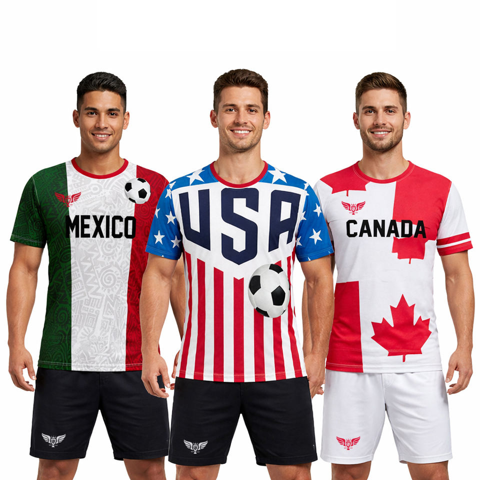 เสื้อฟุตบอลชุดทีมชาติพิมพ์ลายธงชาติ ปี 2026 สำหรับแฟนบอลสหรัฐอเมริกา เม็กซิโก แคนาดา ผลิตจากผ้าโพลีเอสเตอร์