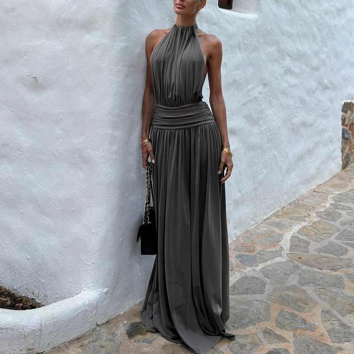 เดรสยาวทรงเข้ารูปแบบผูกคอ คอโอ แขนกุด รุ่นซัมเมอร์ คัสตอม ปี 2026 สำหรับผู้หญิง ดีไซน์หรูหรา ช่วยพรางหุ่น