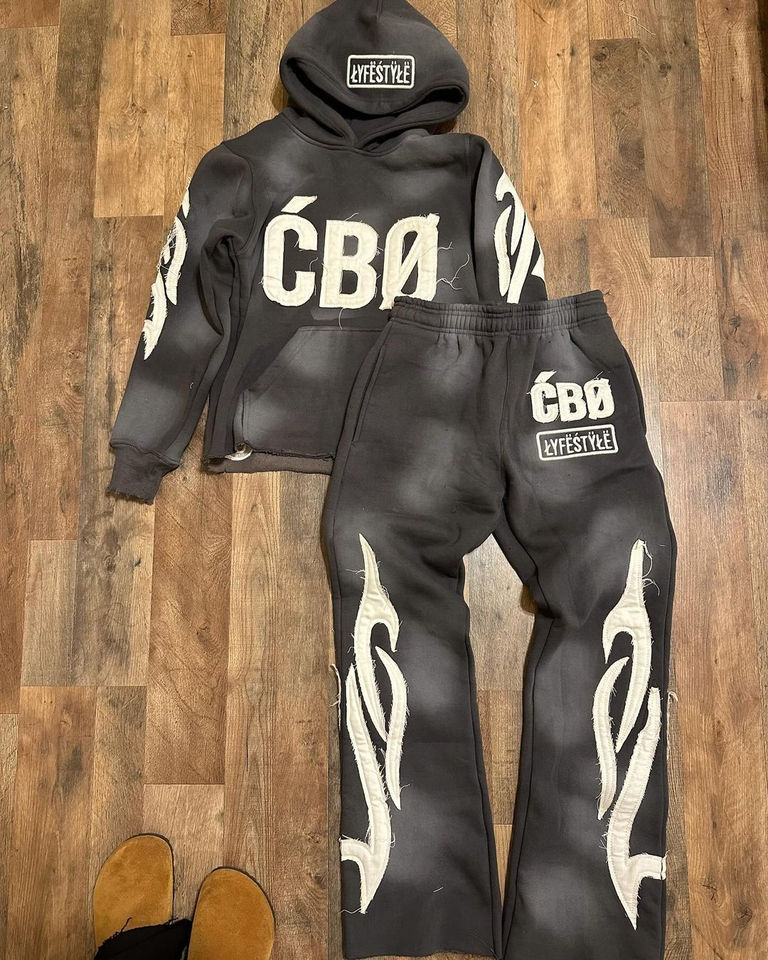 เสื้อฮู้ดดี้และกางเกงวอร์มไซส์ใหญ่พิเศษสำหรับผู้ชายปี 2026 แบบสั่งทำขายส่ง ตกแต่งด้วยงานปักลายขาดๆ แบบดิสเทรส