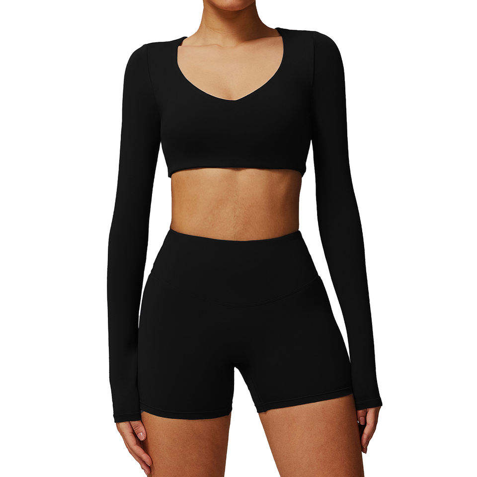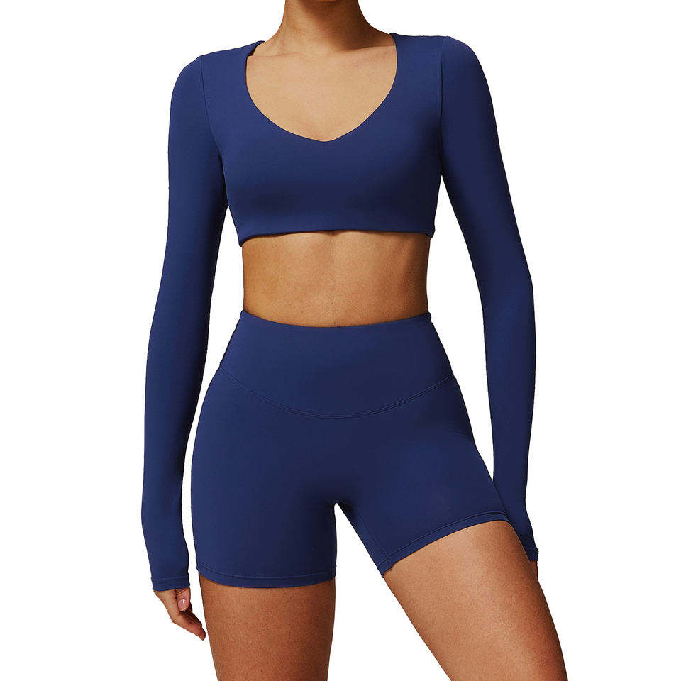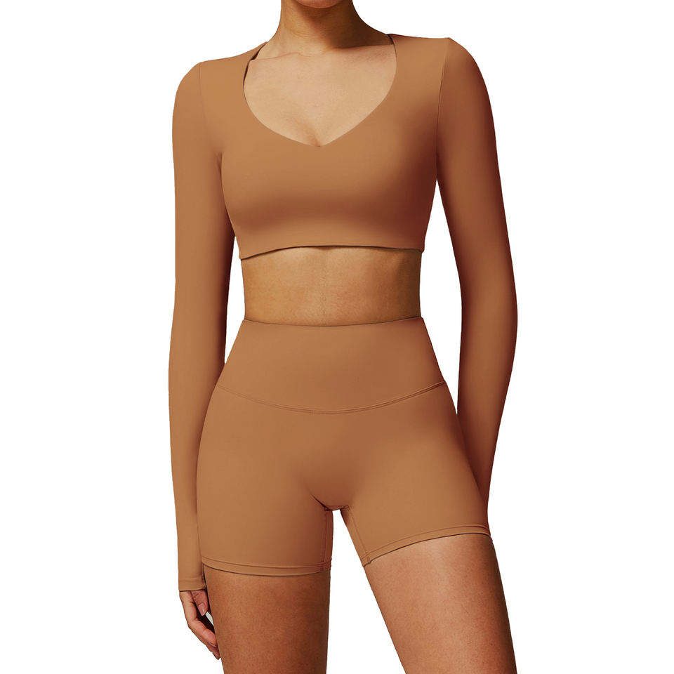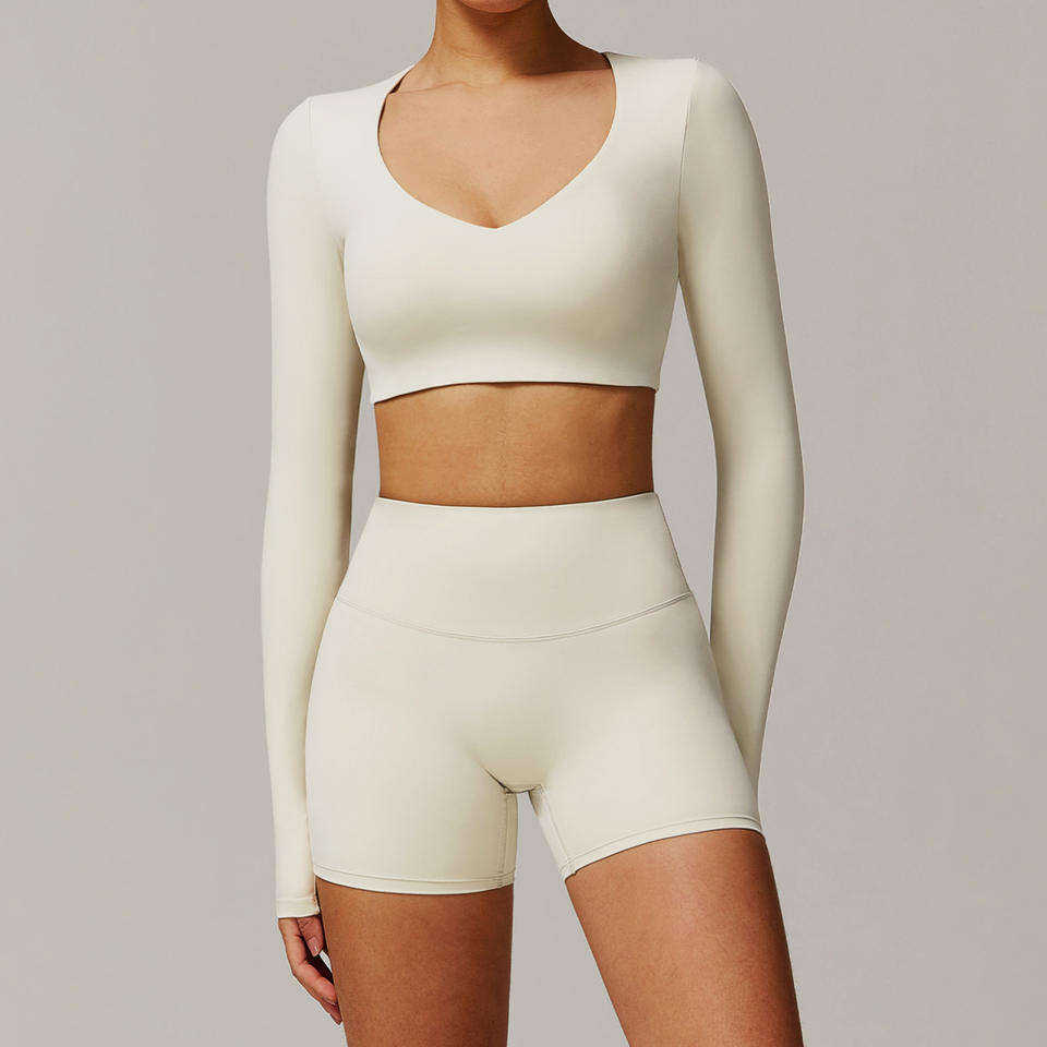 ชุดโยคะกลางแจ้งสำหรับผู้หญิงปี 2026 เสื้อแขนยาวคอวีเนื้อผ้านุ่มกระชับพร้อมกางเกงขาสั้นรัดรูปสำหรับออกกำลังกาย
