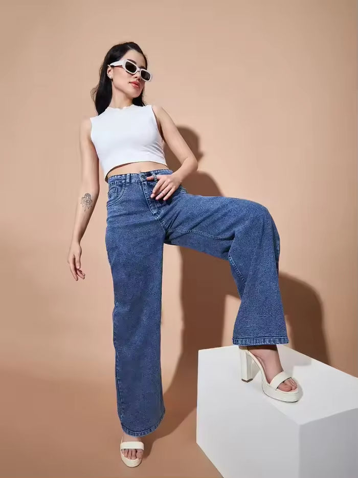กางเกงยีนส์เดนิมสีฟ้าอ่อนเอวกลางทรงหลวมสไตล์ลำลองสำหรับผู้หญิงปี 2026 รุ่น Essie ทรงขาบานแบบ Boot Cut สีเข้ม