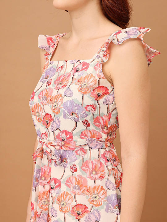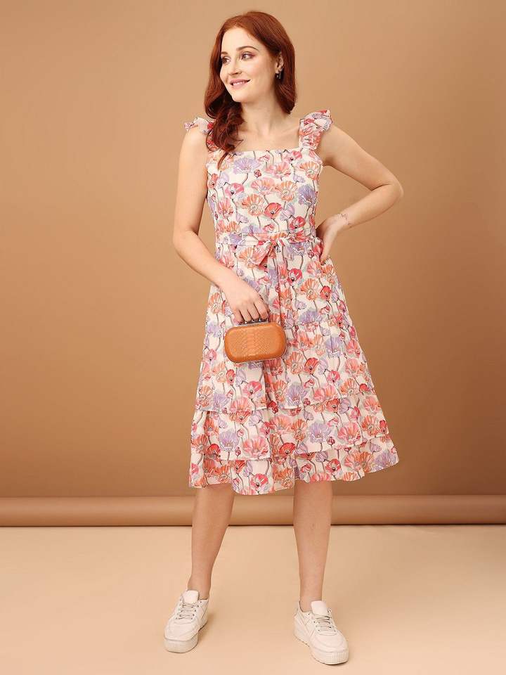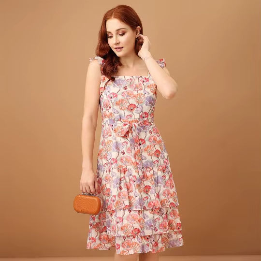 2026 Elegant Design Women Floral Print Shoulder Straps Square Neck Chiffon Fit Flare Midi Summer Dress Natural Breathable Best