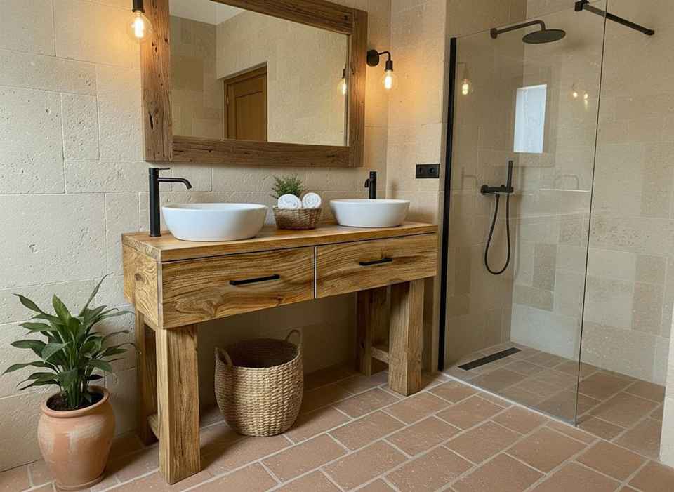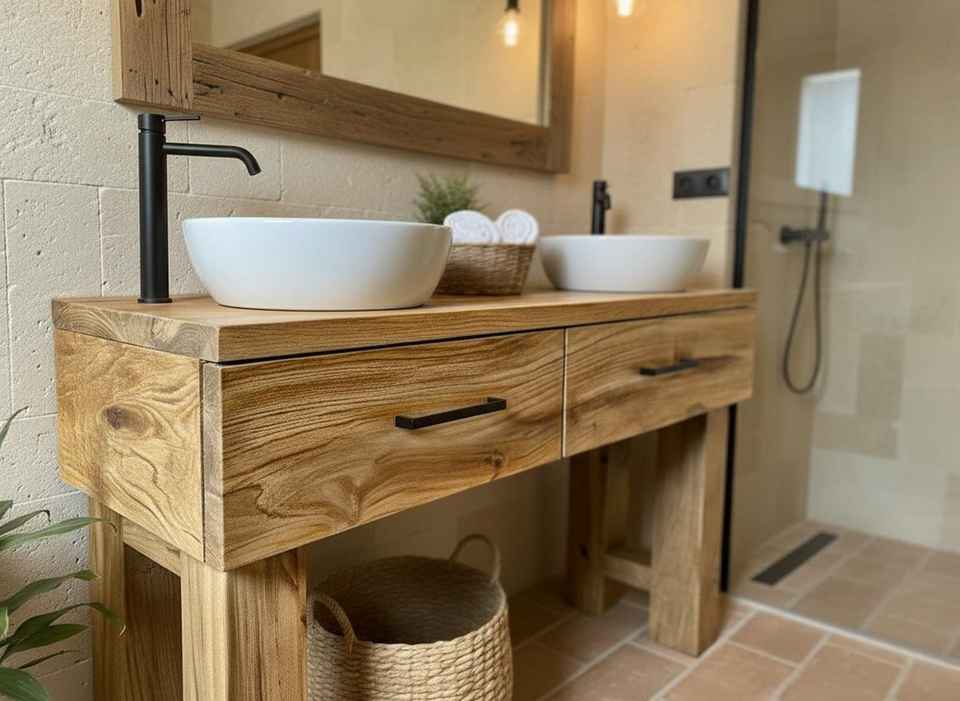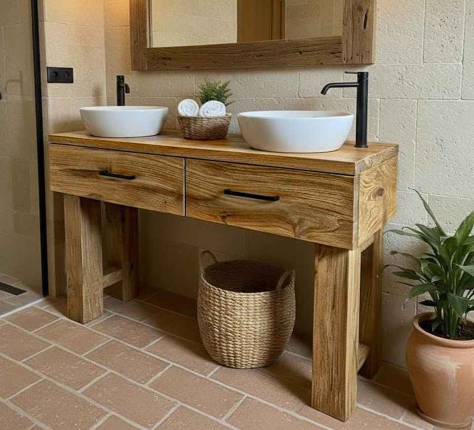 ตู้ห้องน้ำไม้ธรรมชาติสุดหรู ปี 2026 พร้อมอ่างล้างหน้าคู่ ตู้เก็บของ เฟอร์นิเจอร์ห้องน้ำทันสมัย สำหรับใช้ในบ้านและโรงแรม