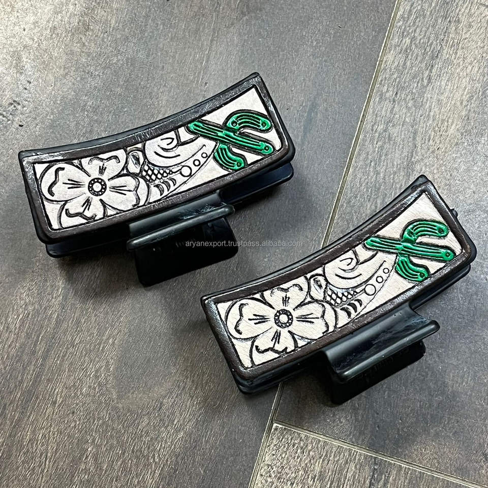 กิ๊บติดผมหนังวัวแท้ลายดอกไม้และลายกระบองเพชร ดีไซน์เก๋ไก๋แบบคาวเกิร์ล โบโฮ ปี 2026 ผลิตโดย OEM ตกแต่งด้วยมืออย่างประณีต