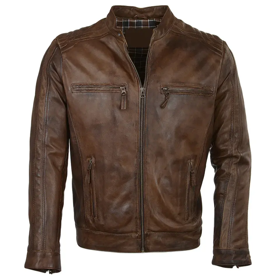 แจ็คเก็ตหนังผู้ชายคุณภาพสูงจากโรงงานปี 2026 สไตล์เท่ห์สำหรับใส่กลางแจ้ง ผ้าแคนวาส แต่งซิปที่คอและตัวเสื้อ เหมาะสำหรับฤดูหนาว