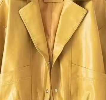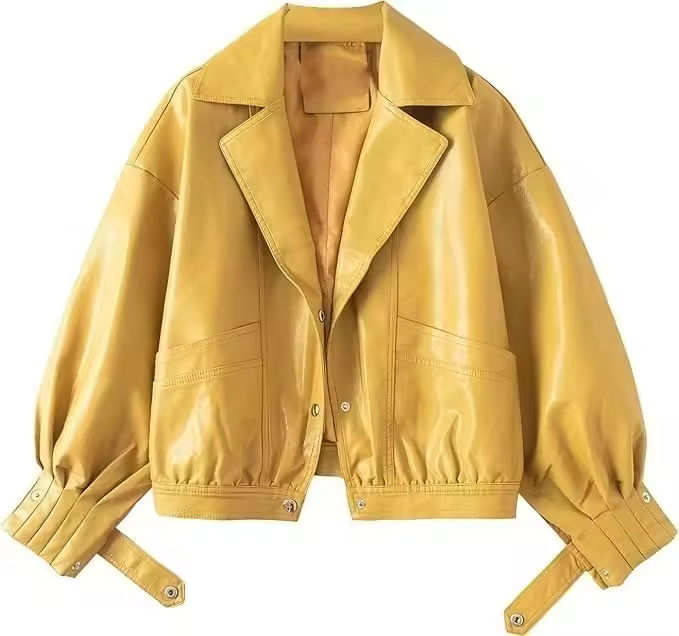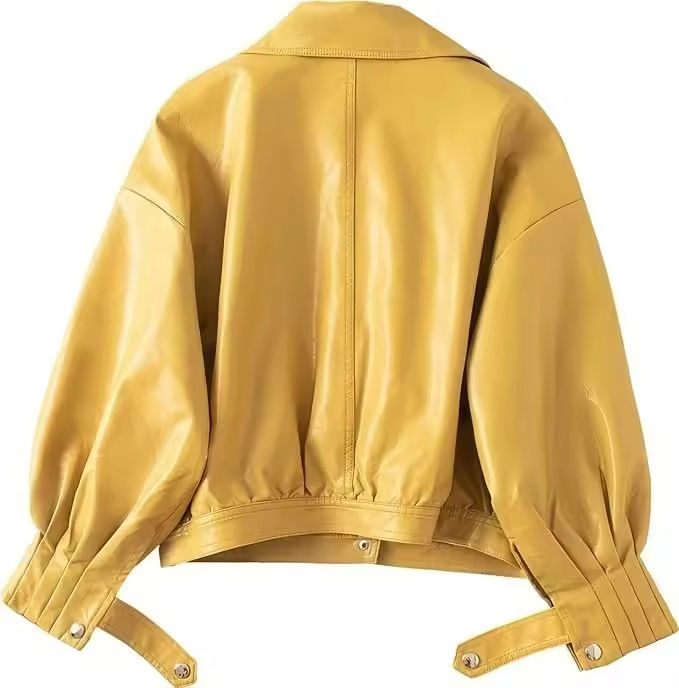 แจ็คเก็ตหนังแท้คุณภาพสูง ระบายอากาศได้ดี สำหรับผู้หญิง สีเหลือง ทรงหลวม แขนจีบ โอเวอร์ไซส์ ปี 2026