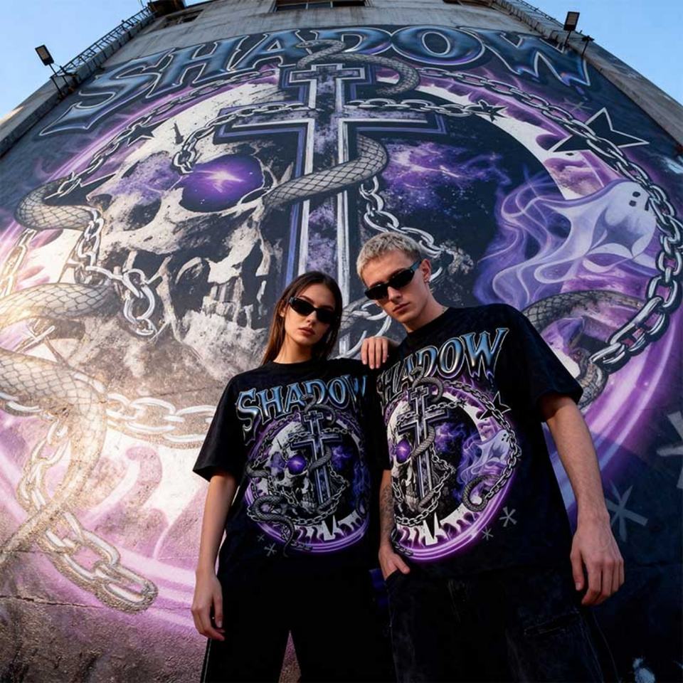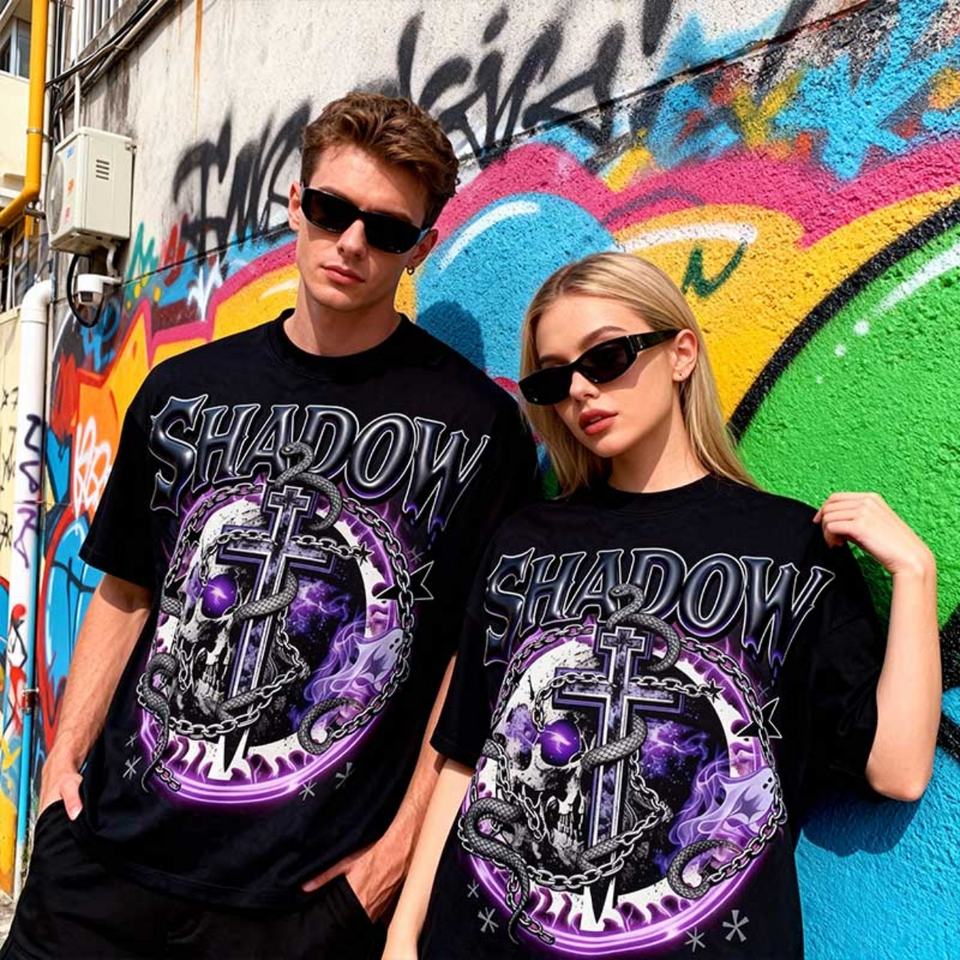 เสื้อยืดโอเวอร์ไซส์ทรงบ็อกซี่ลายกราฟิกสตรีทแวร์สำหรับผู้ชาย รุ่นฮิตขายดีปี 2026 พิมพ์ลาย DTG แบบ Acid Wash ไหล่ตก