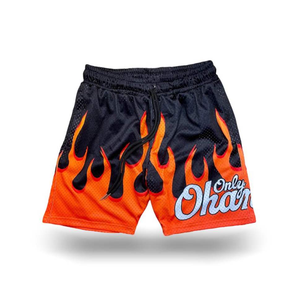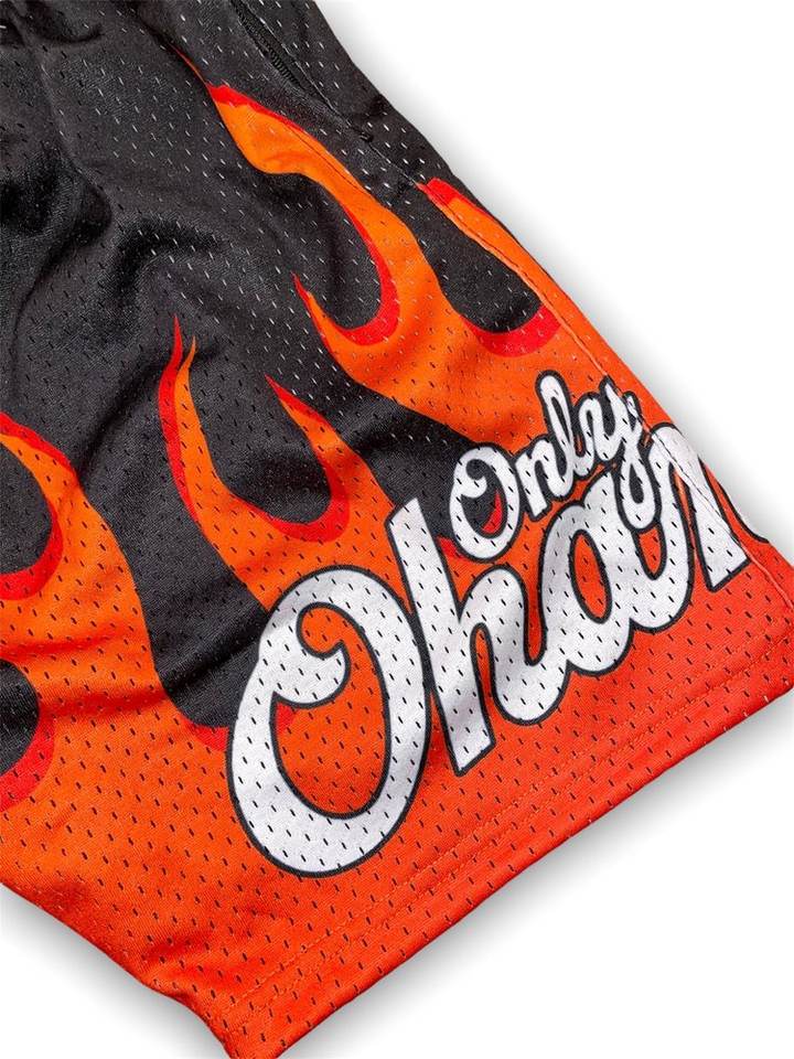 กางเกงขาสั้นตาข่ายพิมพ์ลายเปลวไฟแฟชั่นผู้ชายสุดฮิตขายดีปี 2026 กางเกงขาสั้นตาข่ายสั่งทำพิเศษสำหรับผู้ชาย