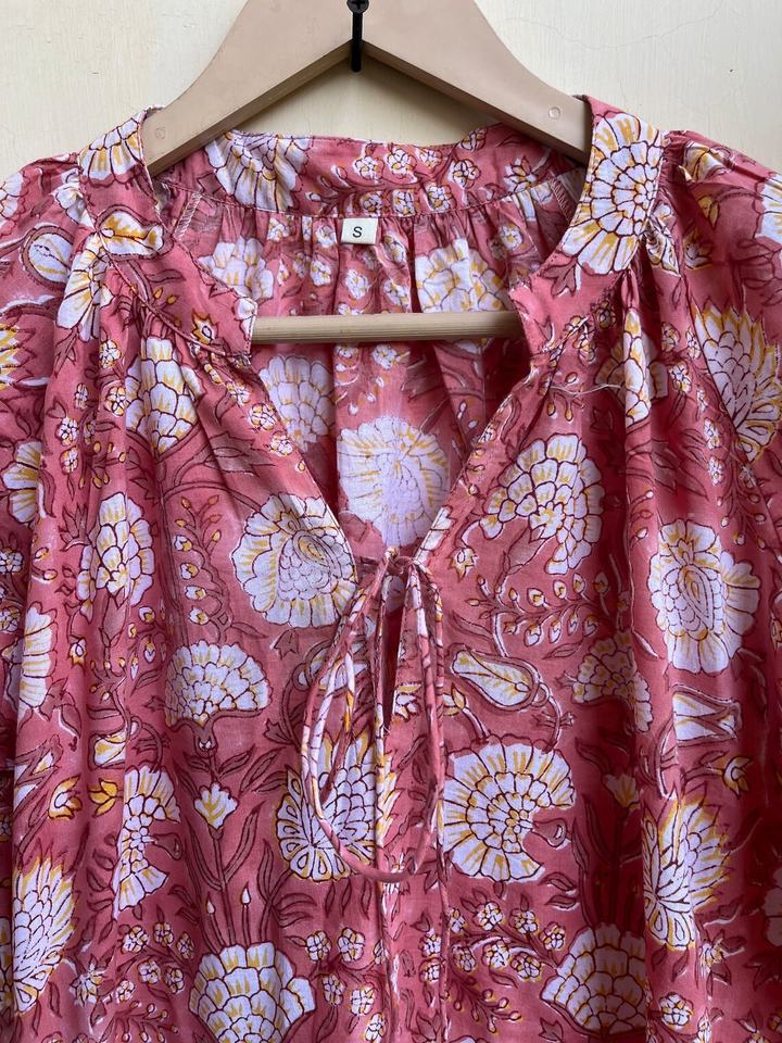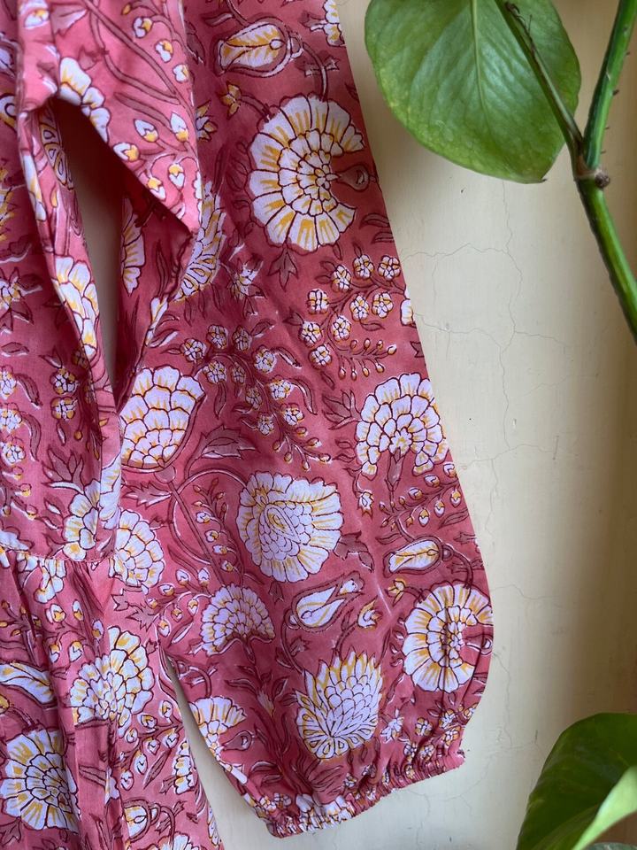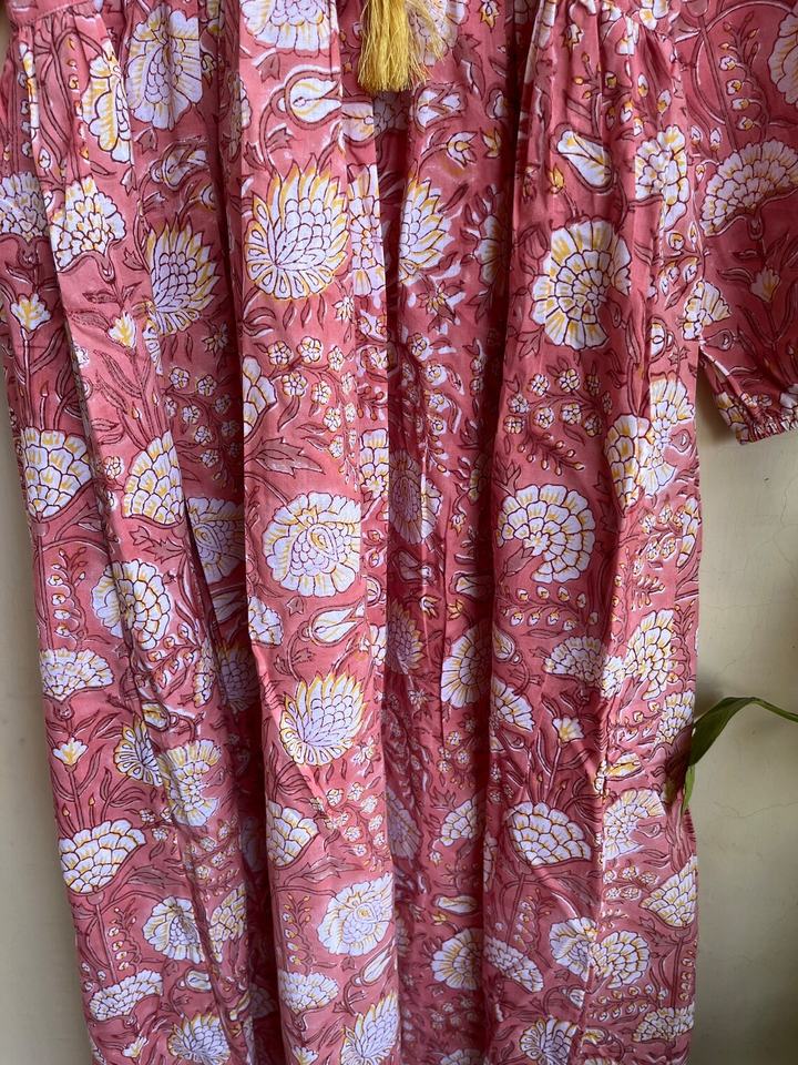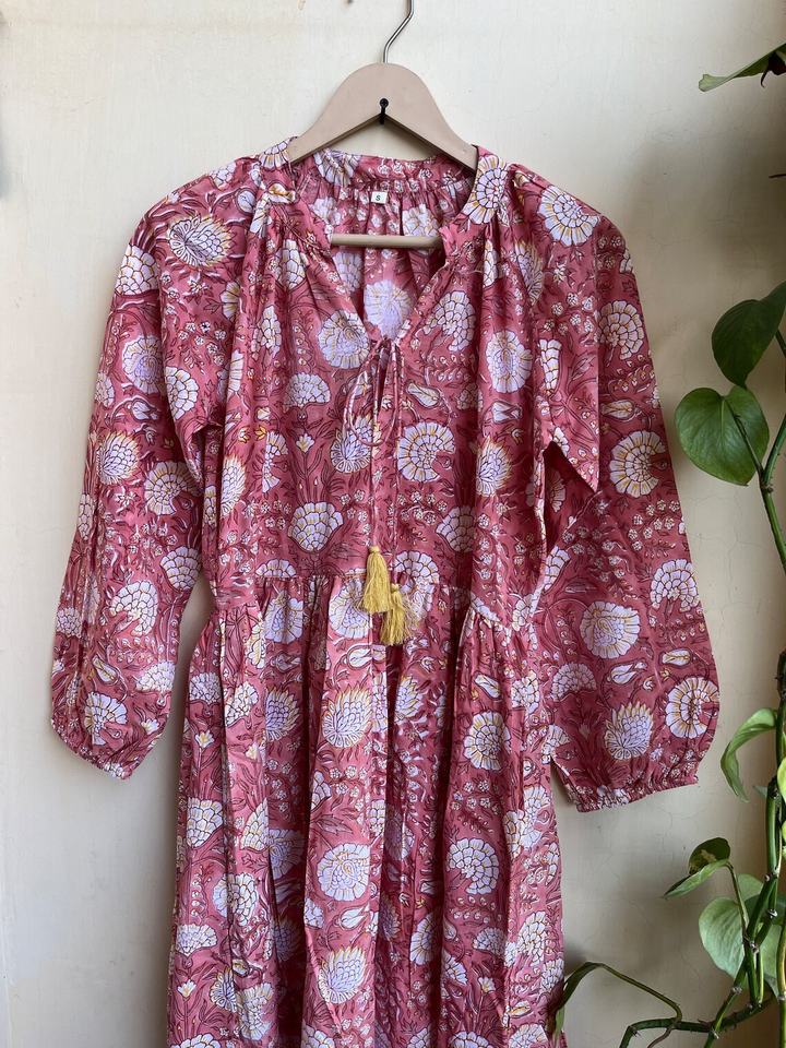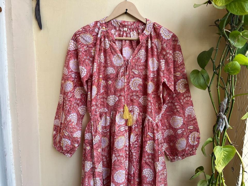 เดรสยาวพิมพ์ลายบล็อกขายดีปี 2026 คอวี แขนยาว ผ้าฝ้าย เดรสยาวสไตล์อินเดียสำหรับผู้หญิง