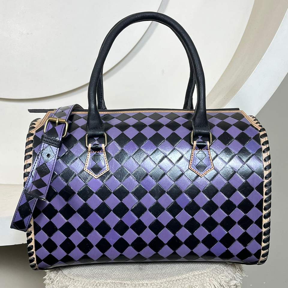 กระเป๋าผ้าใบหนังวัวแท้ลายตาราง ทำมือ