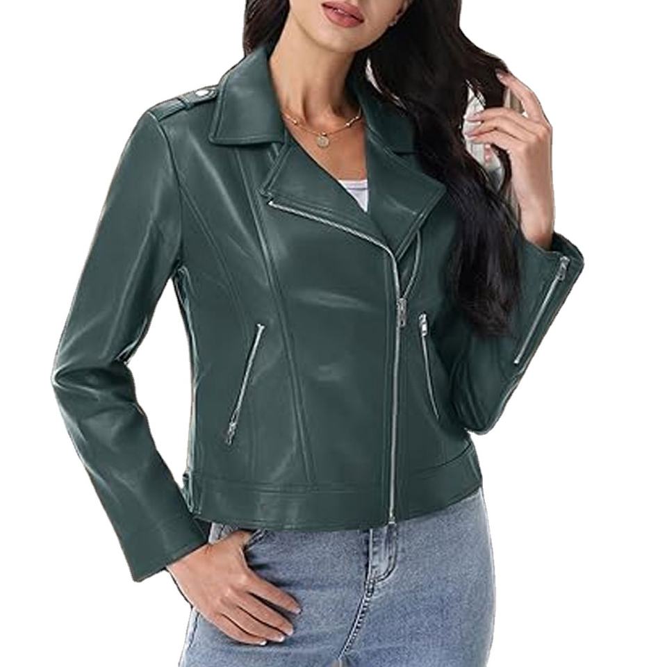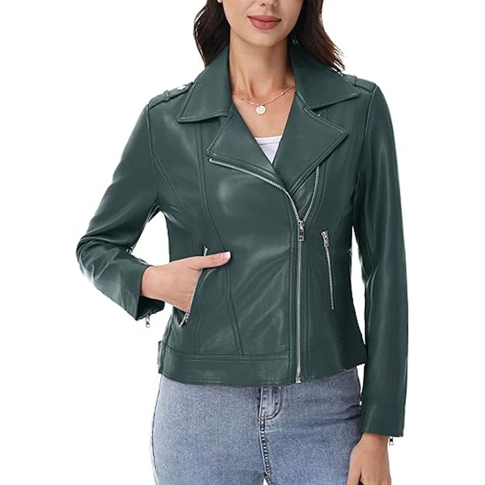 แจ็คเก็ตหนังแท้ผู้หญิง แขนยาว สีพื้น ระบายอากาศได้ดี เป็นมิตรกับสิ่งแวดล้อม กันลม ขายดี ปี 2026 ที่นูรัก