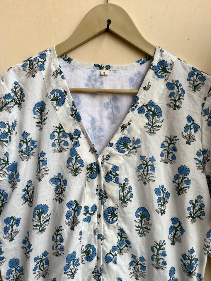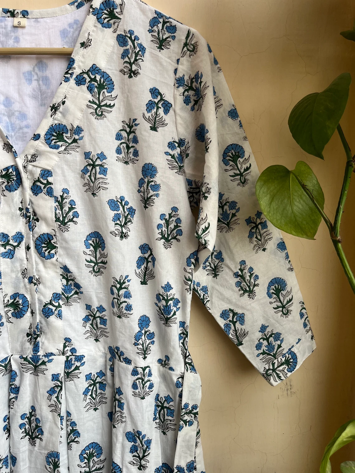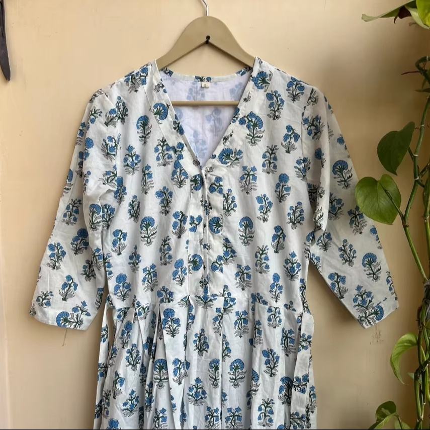 เดรสพิมพ์ลายบล็อกมือแบบฮิตขายดีปี 2026 คอวี แขนยาว ลายดอกไม้ เสื้อคลุมสไตล์อินเดีย ผ้าฝ้ายอินเดีย ชุดยาวสำหรับผู้หญิง