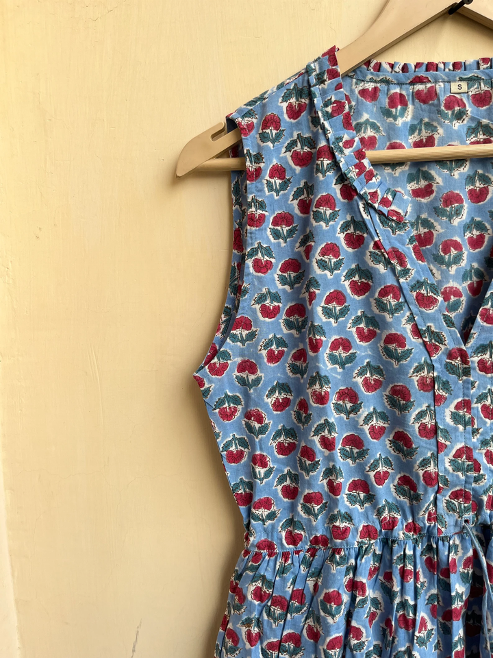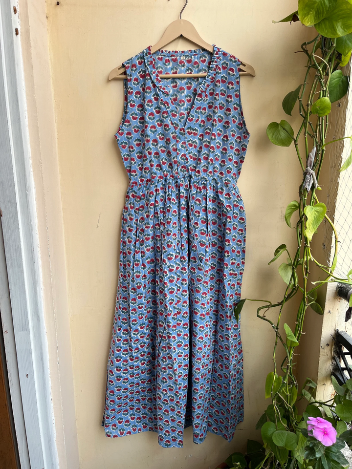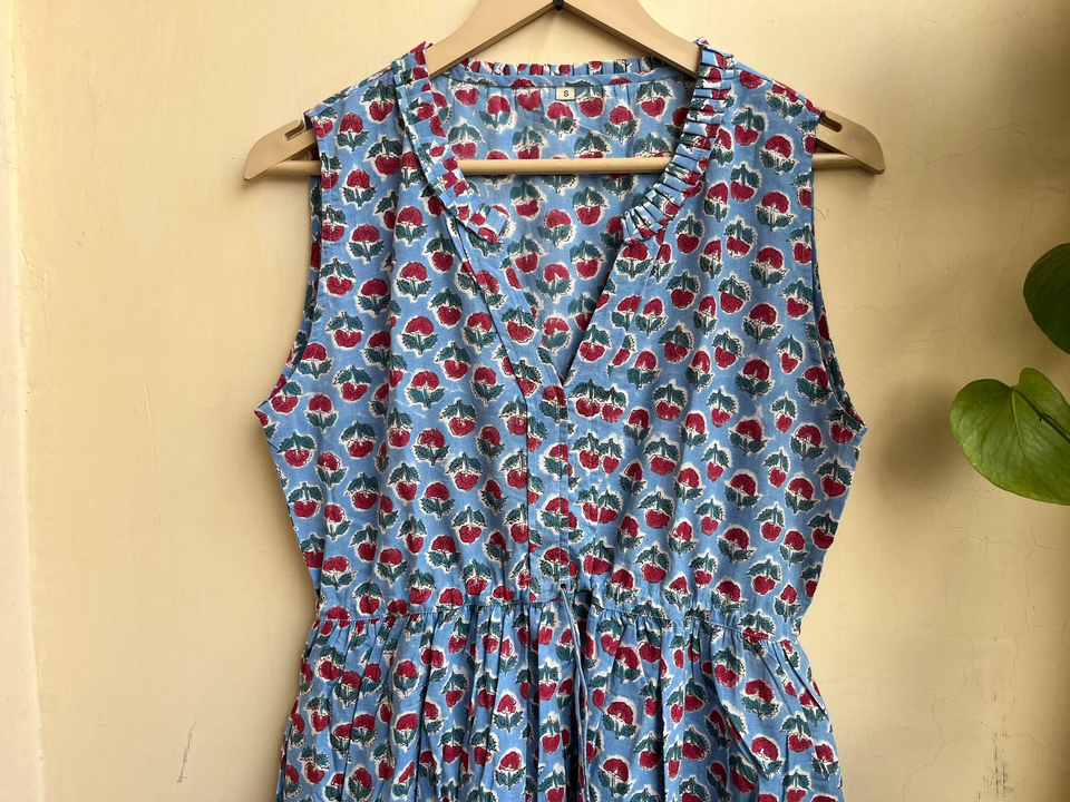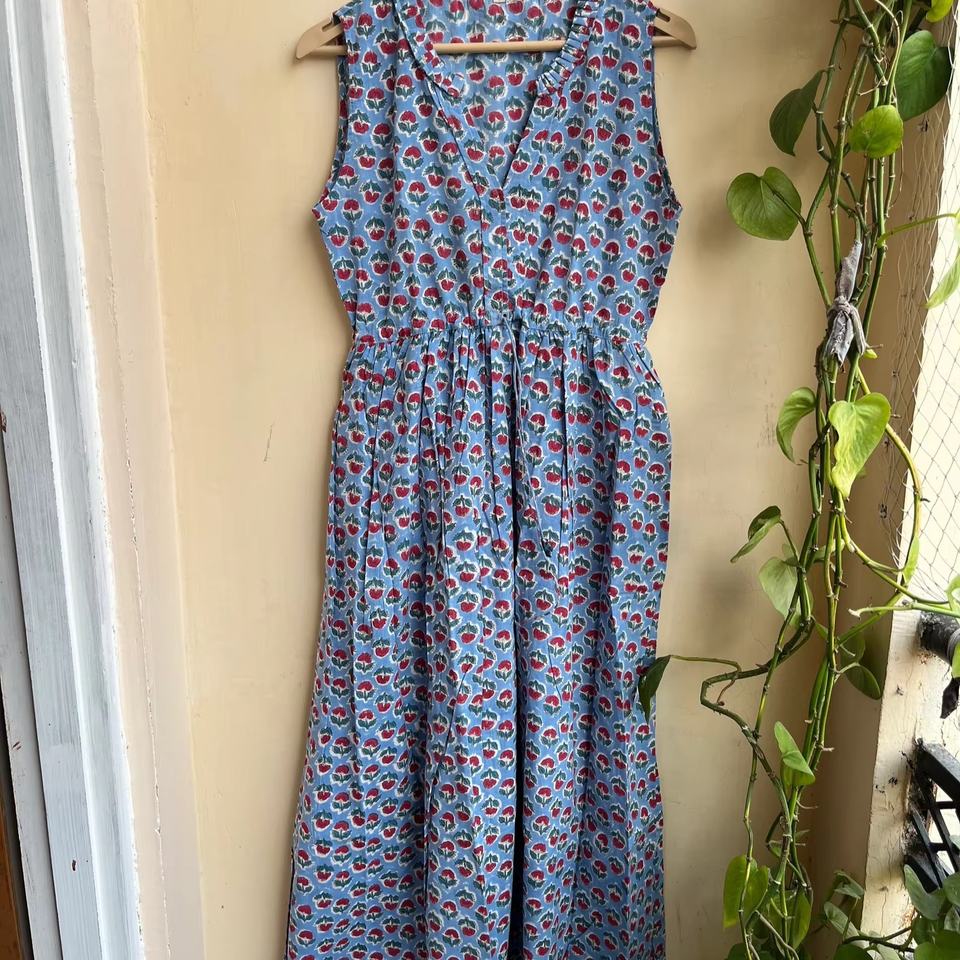 เดรสพิมพ์ลายบล็อกมือแบบฮิตขายดีปี 2026 คอวี แขนกุด สไตล์อินเดีย ผ้าฝ้ายอินเดีย ชุดยาวสำหรับผู้หญิง