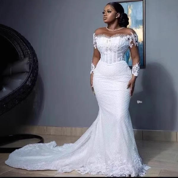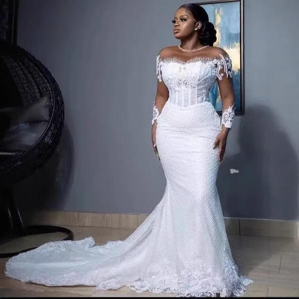 ชุดแต่งงานทรงเมอร์เมดแขนยาว Illusion ปี 2026 ประดับลูกไม้แบบแอพพลิเค ชุดแต่งงานทรงทรัมเป็ต ชายกระโปรงยาวแบบกวาดพื้น ชุดเจ้าสาวสไตล์แอฟริกัน