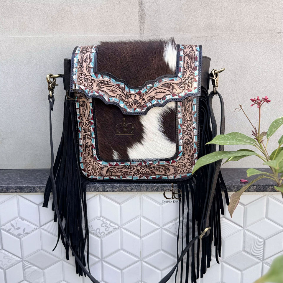 กระเป๋าถือหนังแกะสลักลายด้วยมือ รุ่นล่าสุดปี 2026 พร้อมพู่หนัง แต่งขนสัตว์ สไตล์ยิปซี โบโฮ วินเทจ ทำมือ สะพายข้าง/สะพายไหล่