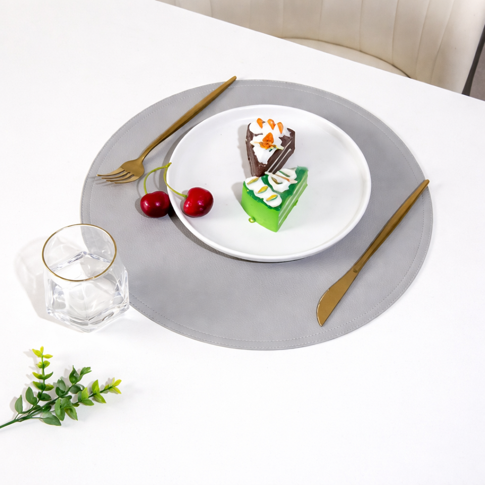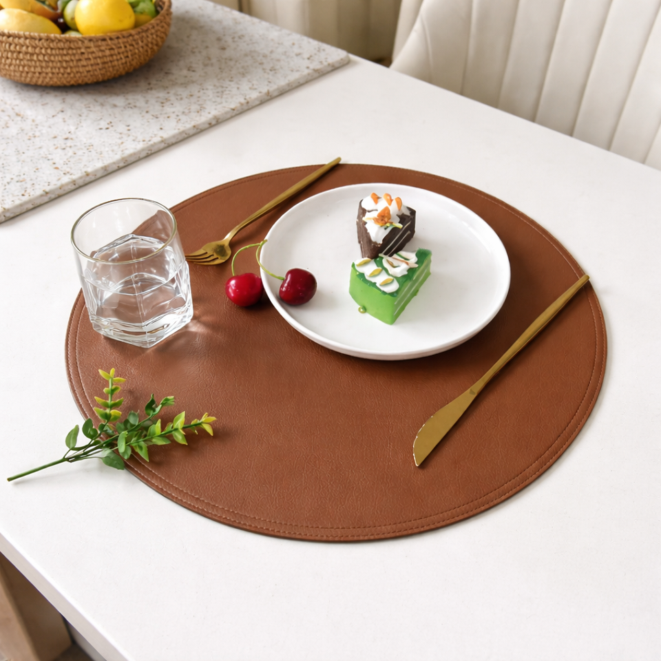แผ่นรองจานหนัง PU ลายใหม่ล่าสุดปี 2026 เช็ดทำความสะอาดได้ เหมาะสำหรับงานเทศกาล บ้านสไตล์โมเดิร์น แผ่นรองโต๊ะทรงกลมแบบกำหนดเองได้ สำหรับโต๊ะกาแฟและโต๊ะอาหาร