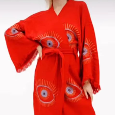 ชุดคลุมผ้าฝ้ายปักลายตาปีศาจสีขาวแบบหลวมๆ ปี 2026 เสื้อคลุมกิโมโนสำหรับผู้หญิงมุสลิม แขนยาว ชุดเดรสคาฟตัน