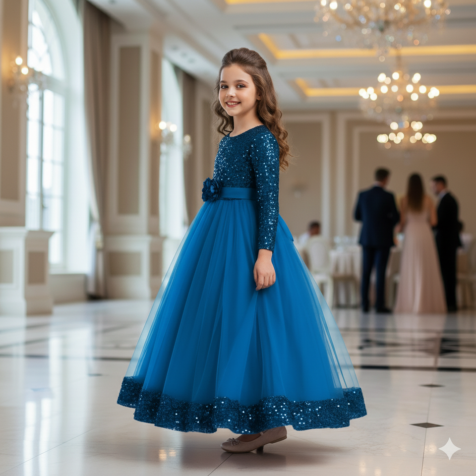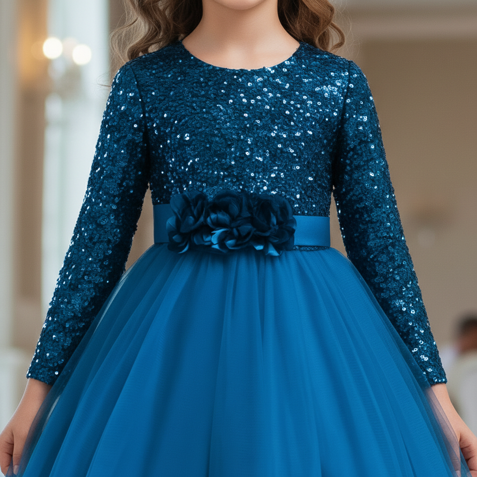 ชุดเดรสเด็กผู้หญิงหรูหราประดับเลื่อมกำมะหยี่ลายดอกไม้ แขนยาว สำหรับงานแต่งงานและงานพิเศษ ปี 2026
