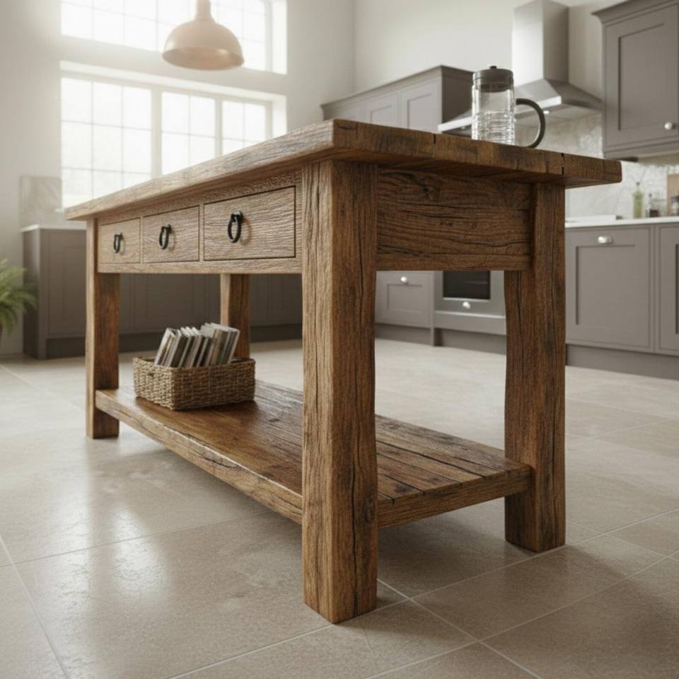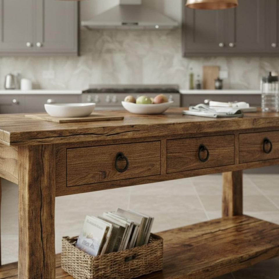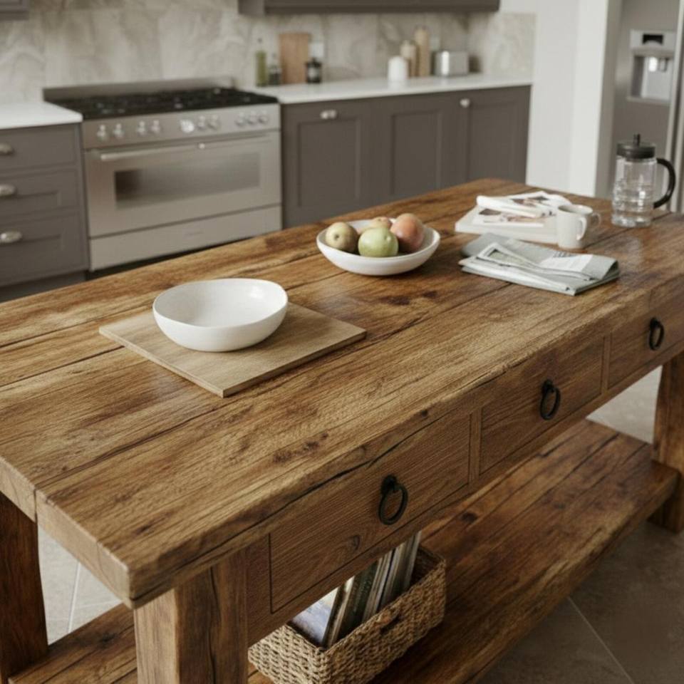 โต๊ะเตรียมอาหารครัวไม้เนื้อแข็งสุดหรู ปี 2026 ออกแบบมาพร้อมลิ้นชักในตัวสามช่อง ชั้นวางด้านล่างขนาดใหญ่ และแข็งแรงทนทาน