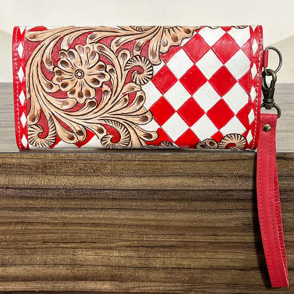 กระเป๋าสตางค์คล้องมือหนังลายตารางหมากรุกทำมือ