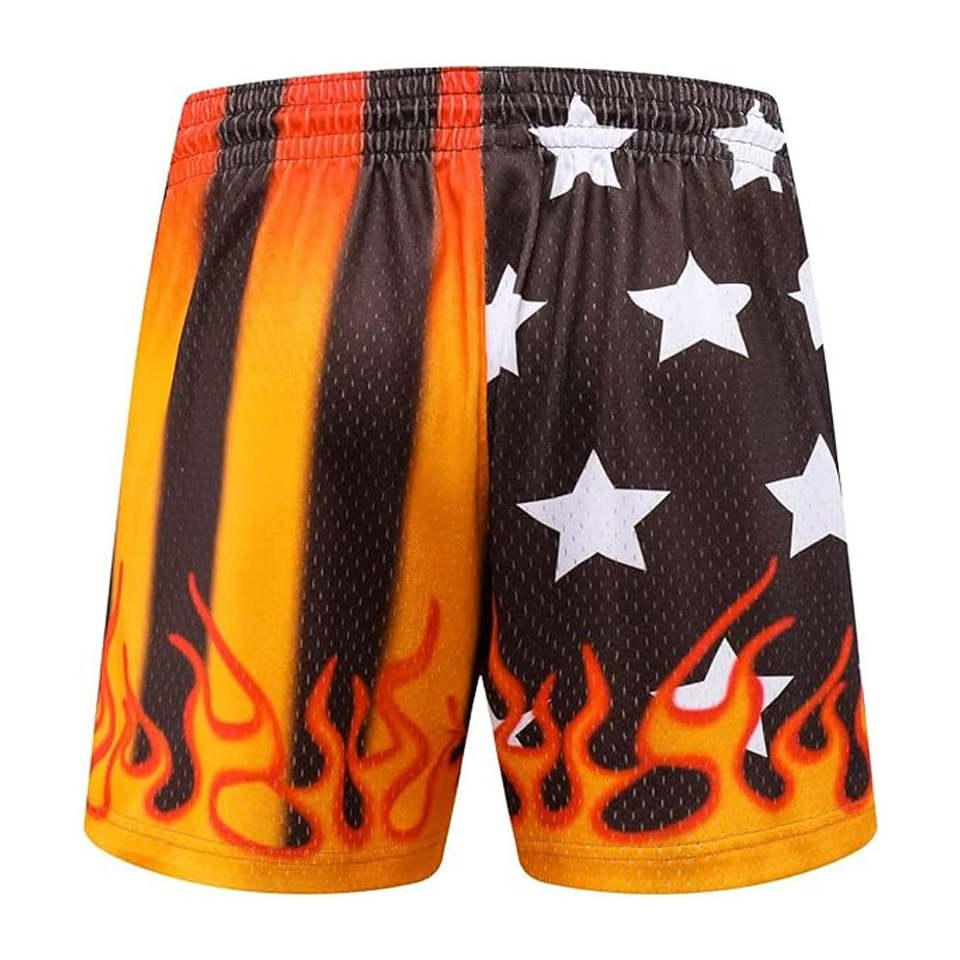 กางเกงบาสเก็ตบอลผู้ชายสีดำ-ส้ม ปี 2026 ลายพิมพ์ดาวและเปลวไฟ กางเกงออกกำลังกายลำลอง ผ้าตาข่าย ระบายอากาศ ลายเรียบ