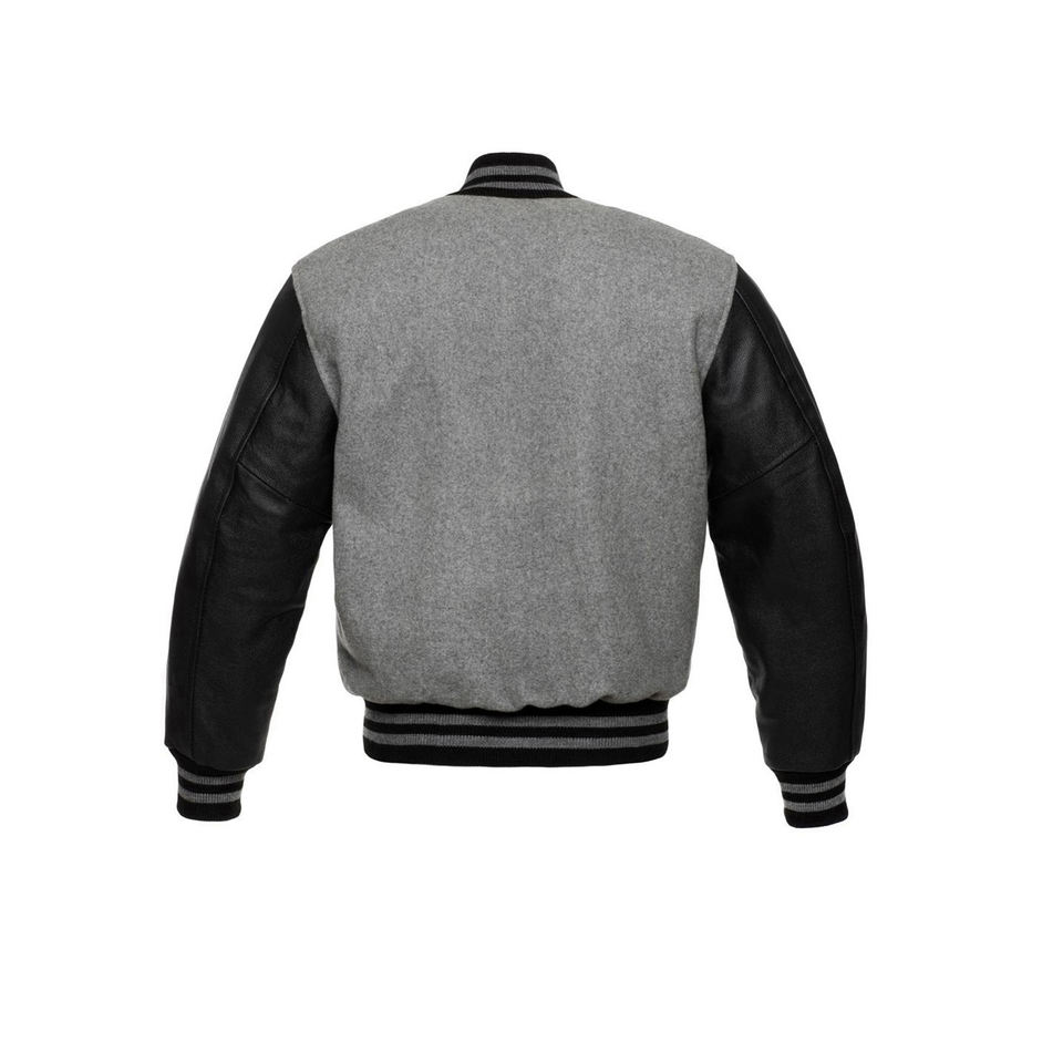 แจ็คเก็ตวาร์ซิตี้สีเทาและสีดำสำหรับผู้ชายปี 2026 ตัวเสื้อทำจากผ้าขนสัตว์ แขนเสื้อทำจากหนัง สไตล์เบสบอลคลาสสิกแบบบอมเบอร์ ติดกระดุมแป๊ก