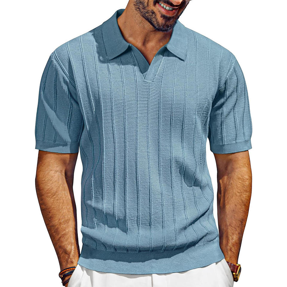 เสื้อโปโลถักเนื้อผ้าพรีเมียมแบบไม่มีกระดุมสำหรับผู้ชายรุ่นใหม่ปี 2026 สีน้ำเงินสไตล์ Old Money เสื้อยืดโปโลสำหรับผู้ชายสวมใส่สบายๆ สไตล์สตรีทแวร์
