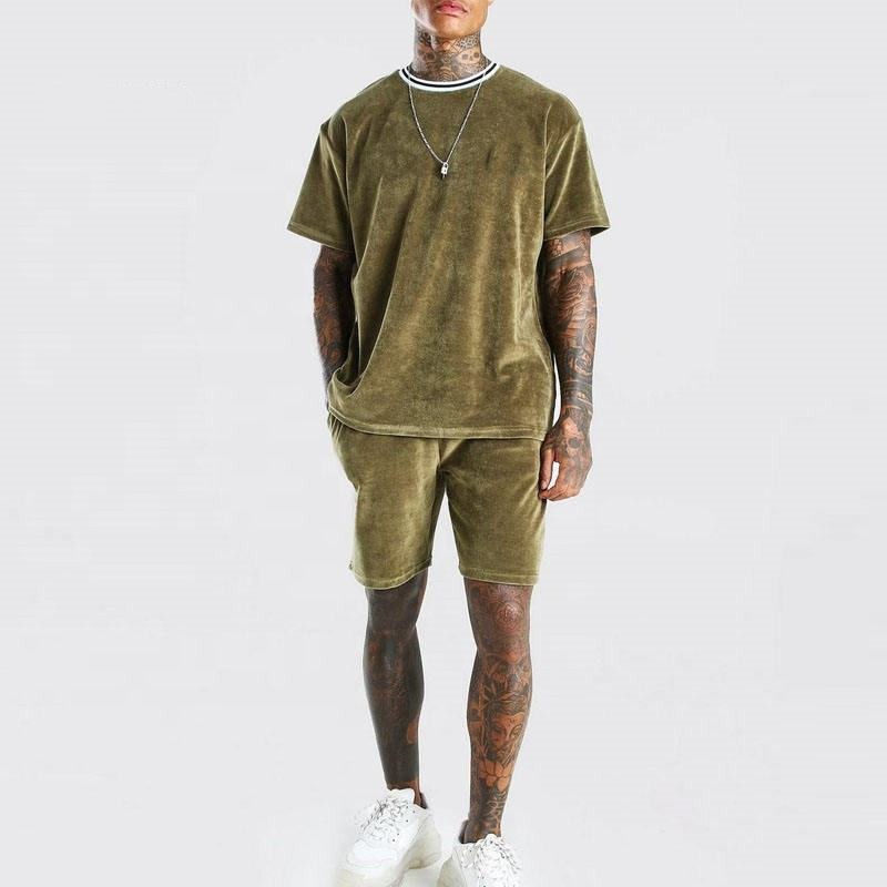 เสื้อยืดกำมะหยี่สีพื้นและกางเกงขาสั้นชุดเซ็ตผู้ชายไซส์ใหญ่ รุ่นใหม่ปี 2026 ชุดวอร์มกำมะหยี่สำหรับฤดูร้อน ออกแบบเองได้ ชุดวิ่งสำหรับผู้ชาย