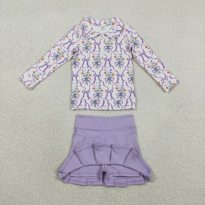 ชุดกีฬาเด็กมาใหม่ปี 2026 เสื้อสีเหลืองม่วงประดับโบว์ กางเกงขาสั้น กระโปรง ชุดโยคะสำหรับเด็กผู้หญิงช่วงฤดูร้อน
