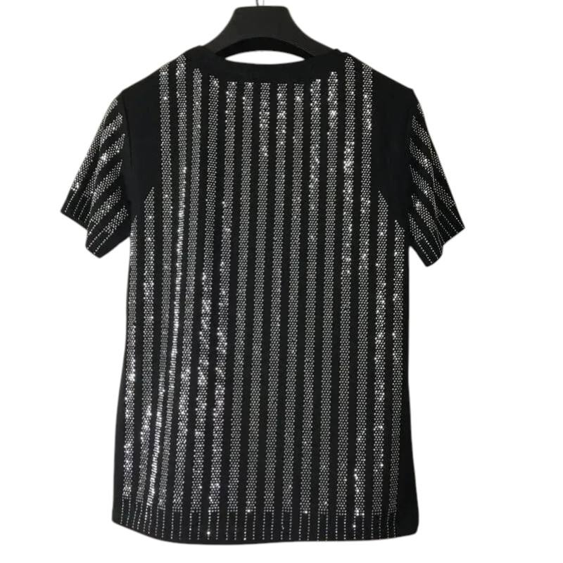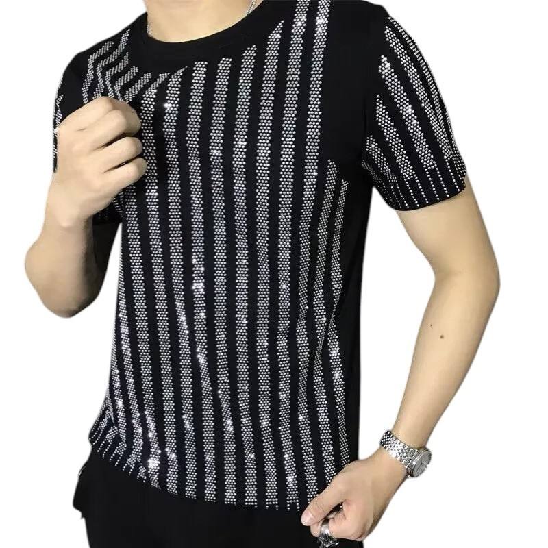 เสื้อยืดผู้ชายสีดำลายเส้นประดับคริสตัลหรูหรา รุ่นใหม่ปี 2026 ประกายวิบวับ สไตล์สตรีทแวร์ เหมาะสำหรับงานปาร์ตี้และแฟชั่น