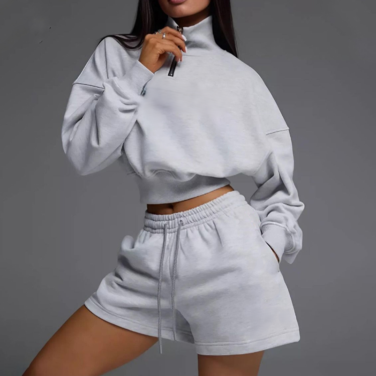 ชุดเสื้อสเวตเชิ้ตครึ่งซิปและกางเกงขาสั้นลำลองสำหรับผู้หญิง ดีไซน์ใหม่ปี 2026 เอวยางยืด ผลิตตามสั่ง สำหรับฤดูใบไม้ผลิ