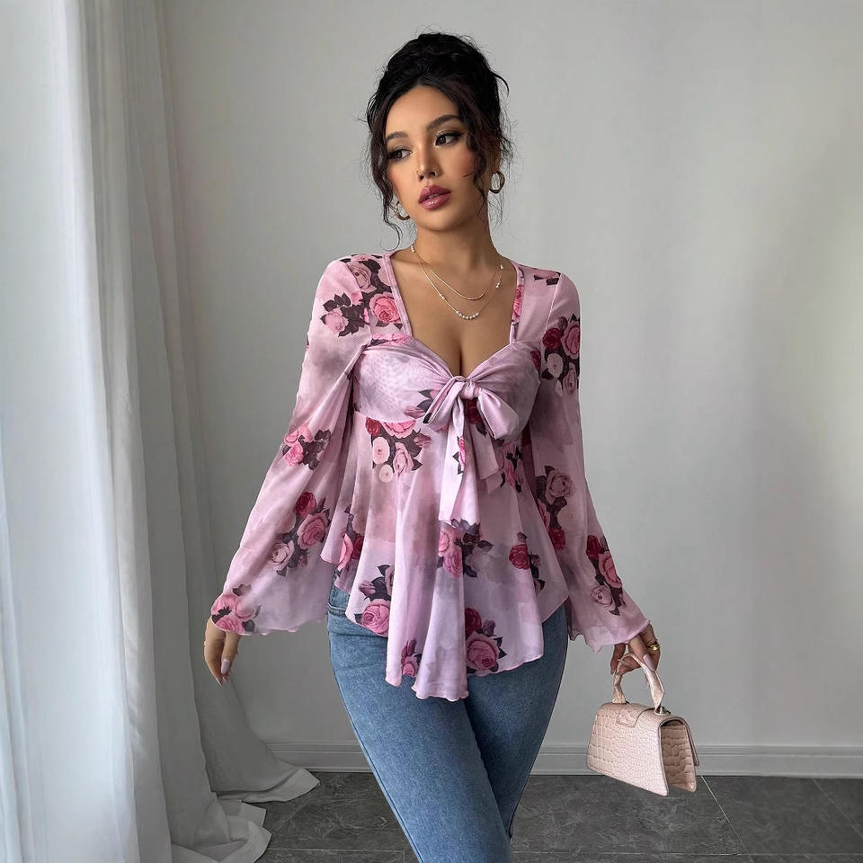 เสื้อผ้าสไตล์ฝรั่งเศสลายดอกไม้หวานๆ ดีไซน์ใหม่ปี 2026 แขนยาวทรงบาน คอเหลี่ยม สวยหรู น่ารัก สไตล์ฤดูใบไม้ผลิ ผลิตจากโพลีเอสเตอร์