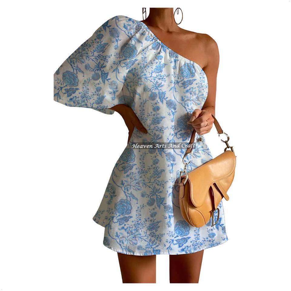 ชุดเดรสแขนพองไหล่เดียวพิมพ์ลายผ้าฝ้าย 100%, ผ้าฝ้ายทอ