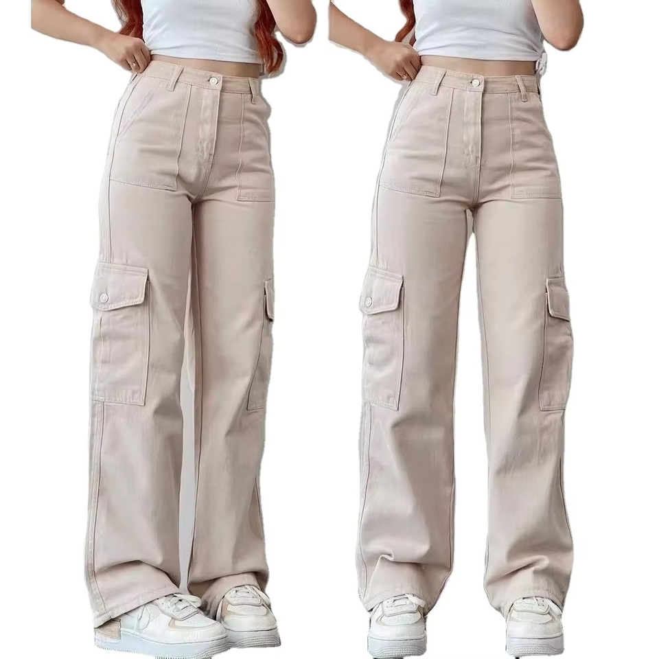 กางเกงคาร์โก้เอวสม็อคแฟชั่นใหม่ปี 2026 สำหรับผู้หญิง สไตล์ลำลองสำหรับฤดูหนาว รับสกรีนโลโก้ กางเกงยีนส์ขากว้าง