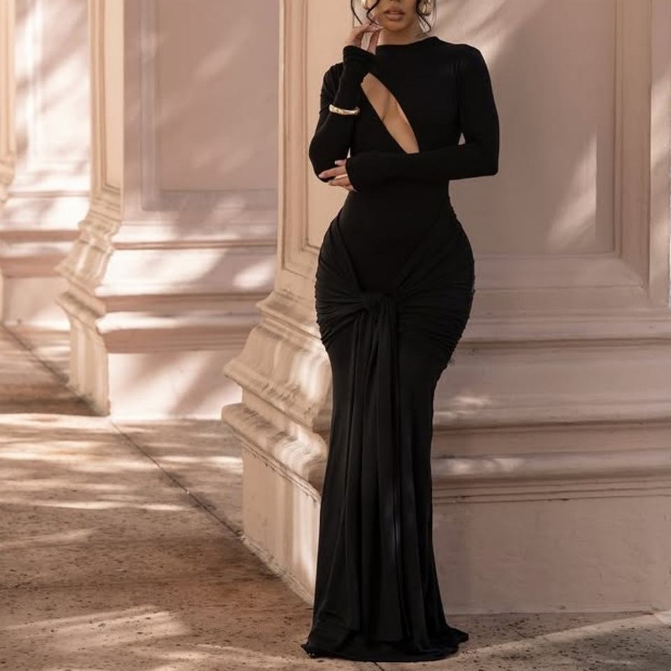 เดรสยาวเซ็กซี่สำหรับงานปาร์ตี้ผู้หญิงปี 2026 แบบเว้าลายจีบแขนยาว